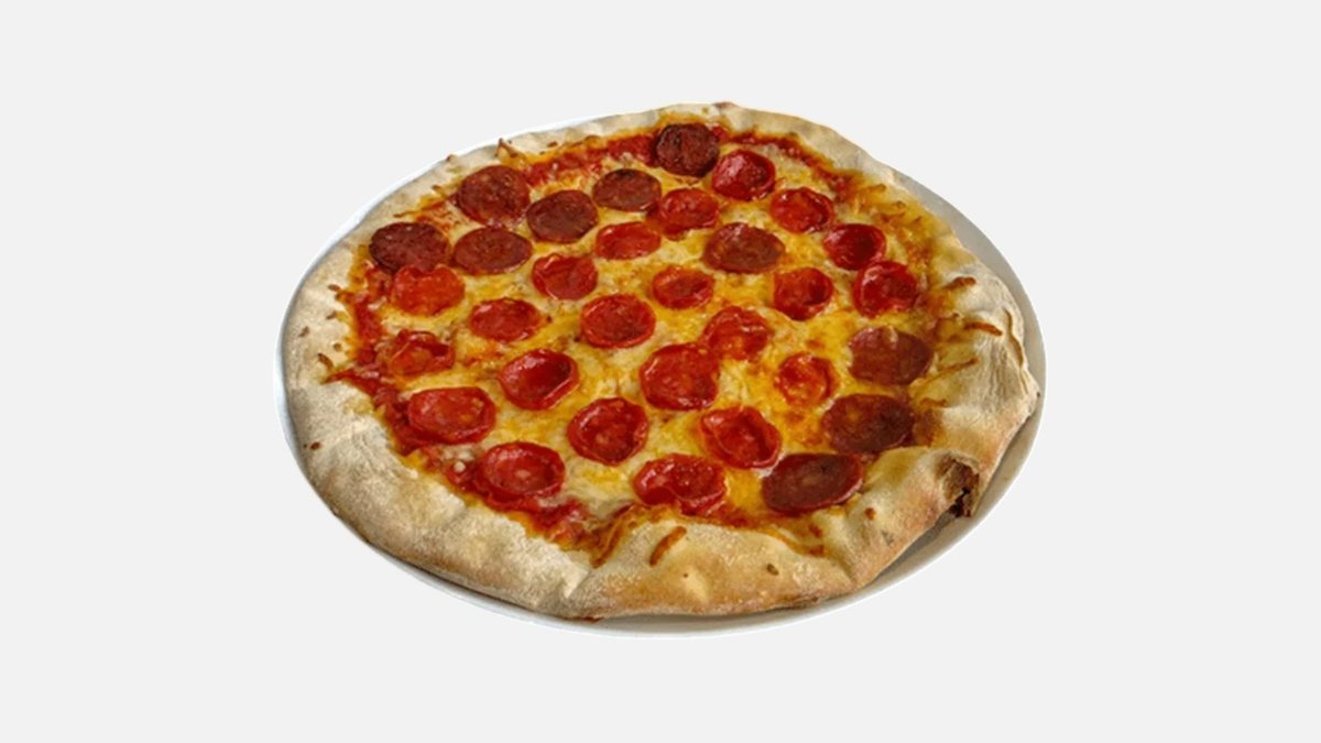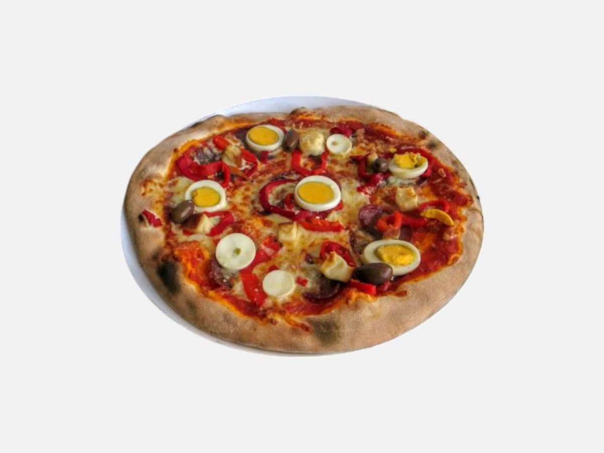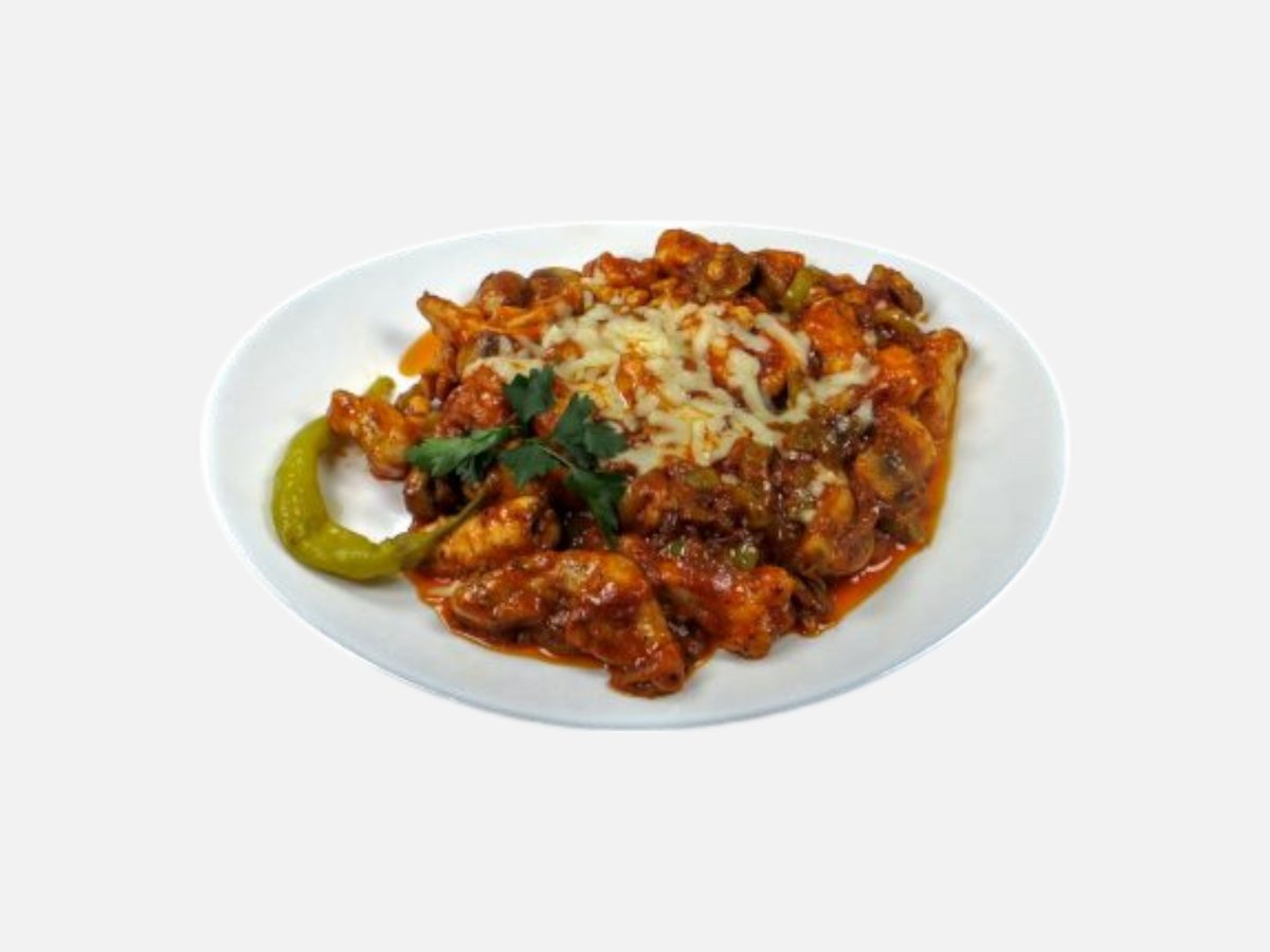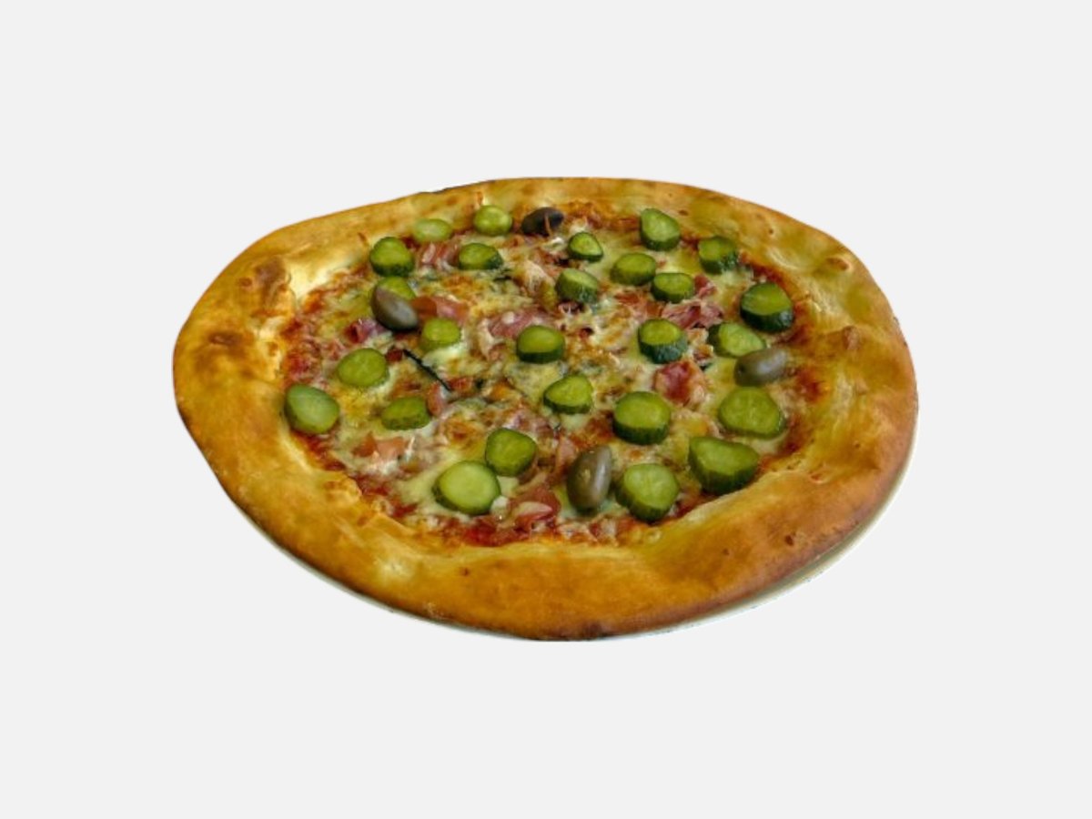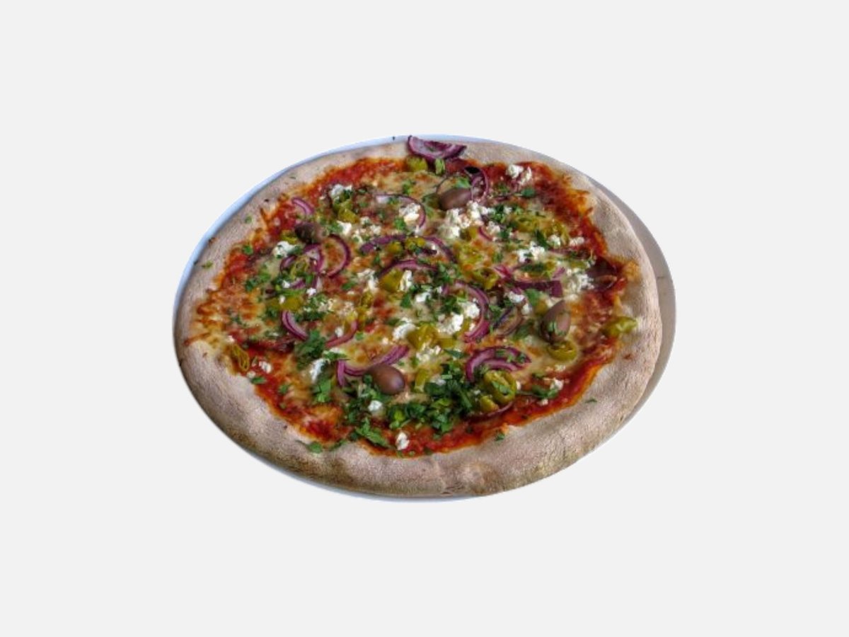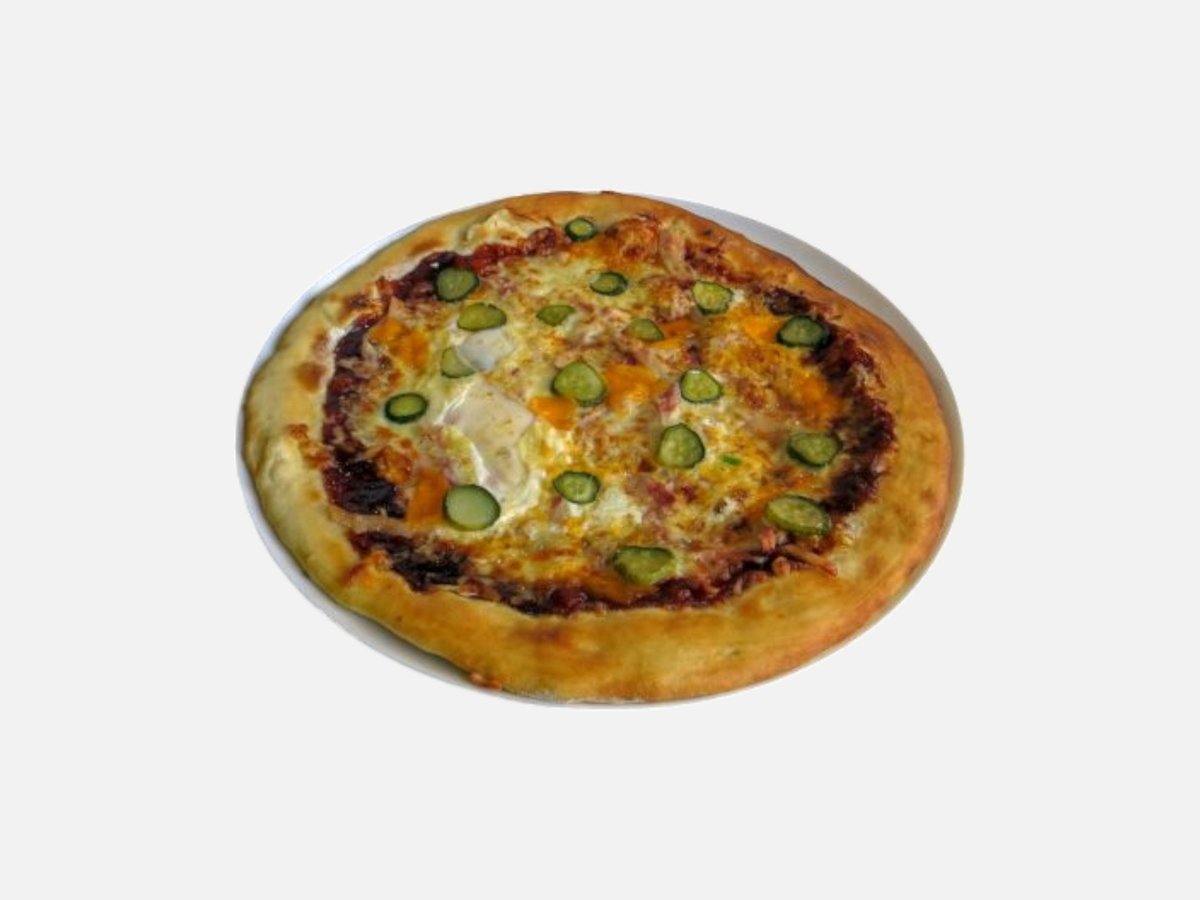 доматен сос, кашкавал, пилешко филе, царевица, топено сирене, маслини, чеснов сос, магданоз 480 г