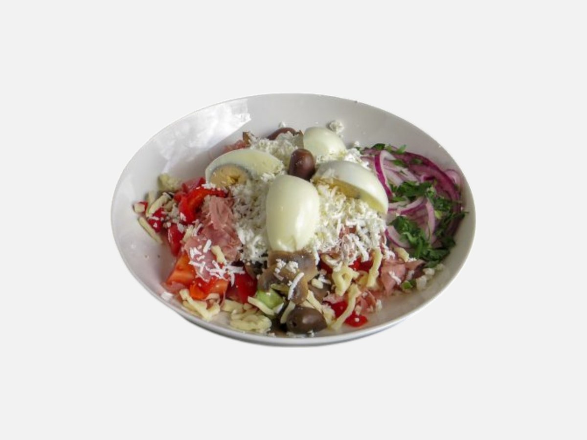 домати, краставици, шунка, яйце, печена капия, сирене, гъби, кашкавал, лук, маслини 460 г