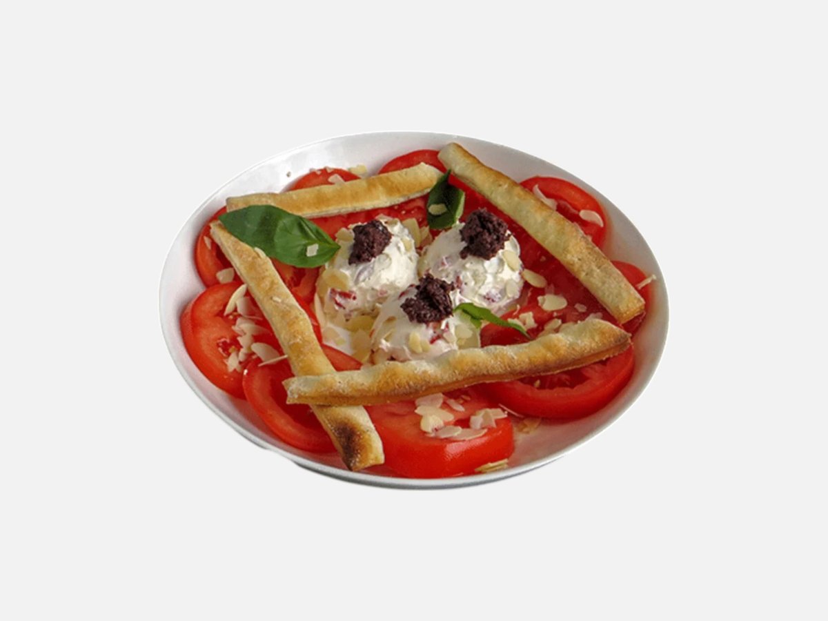 домати, катък, пресен босилек, печена капия, маслинова паста, хлебни пръчици, филиран бадем 430 г