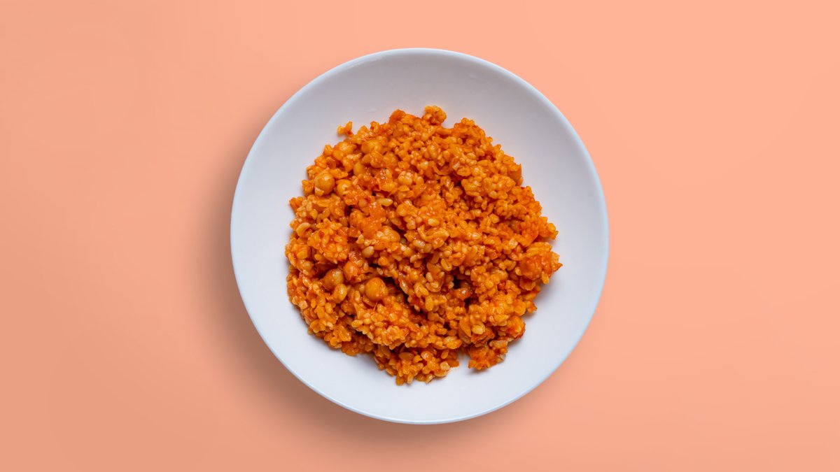 по избор на клиента: леща и булгур и салата или булгур с нахут в доматен сос и салата или басмати ориз и салата или бял ориз балдо и салата или печени картофи и салата и350г.