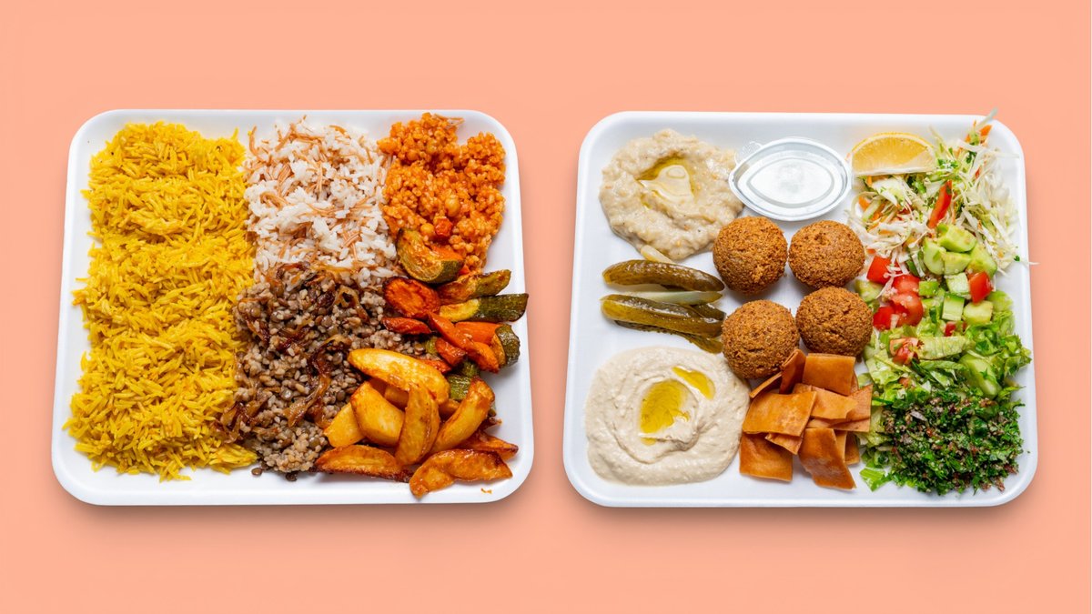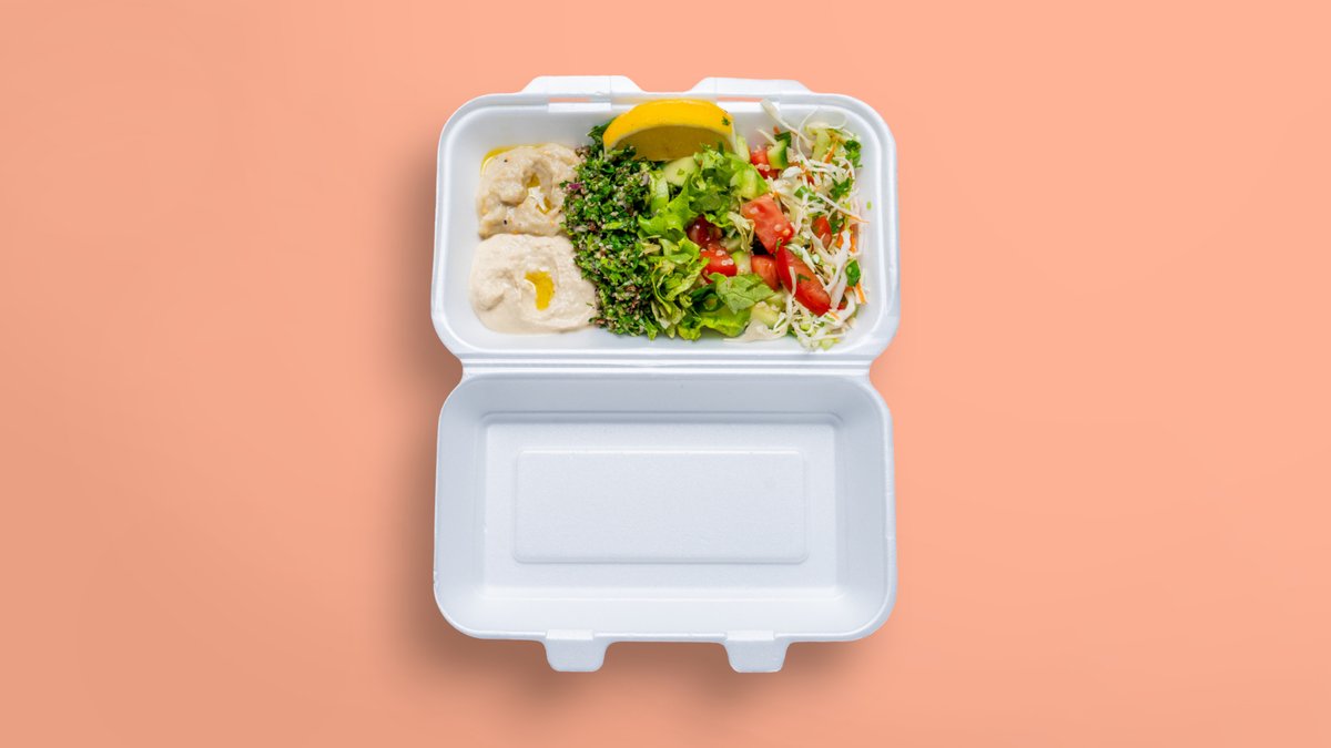 хумус, баба гануш, фалафел, салата фатуш, салата табуле,басмати ориз, арабски ориз с фиде, печени зеленчуци, печени картофи, леща и булгур, булгур и нахут в доматен сос, пържен арабски хляб и подарък две минерални води