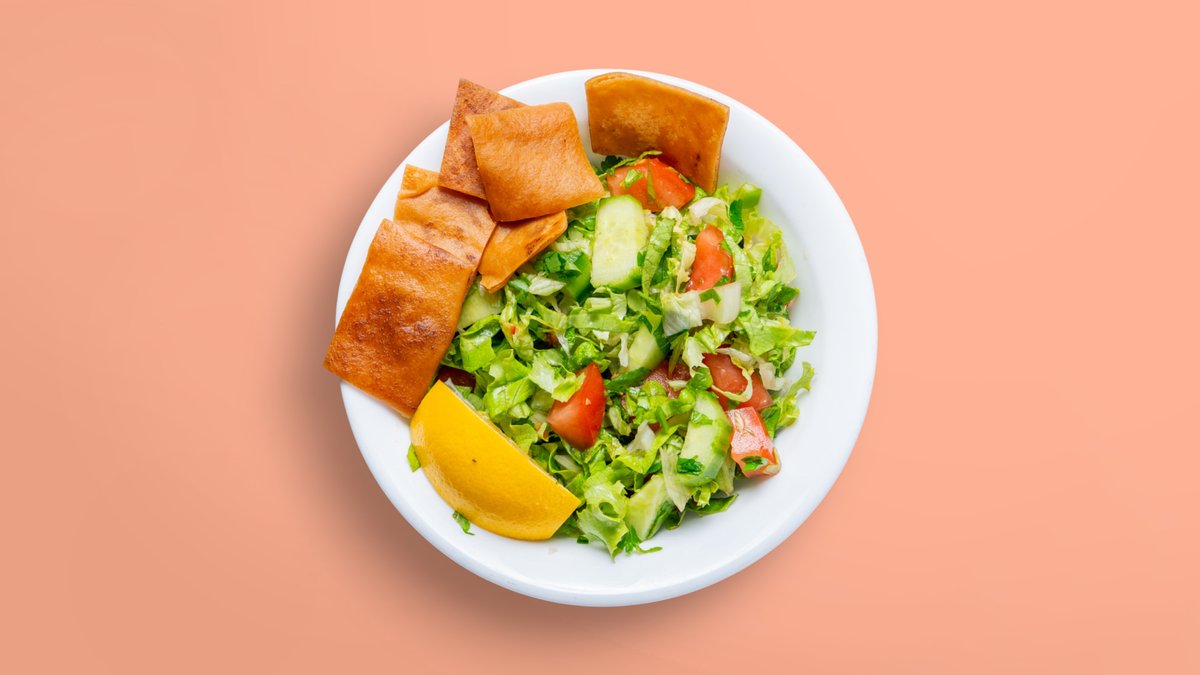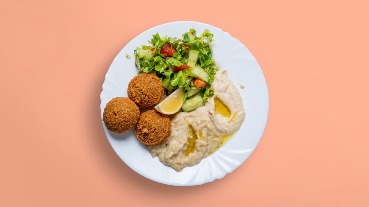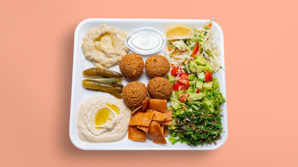 салата фатуш или табуле, 4 бр фалафел, хумус, пържен арабски хляб, таханов сос 350г