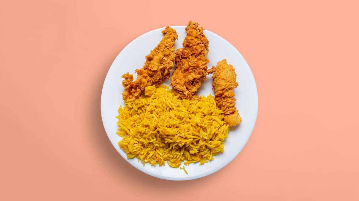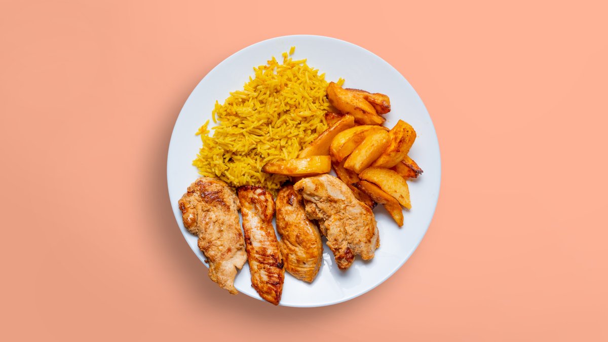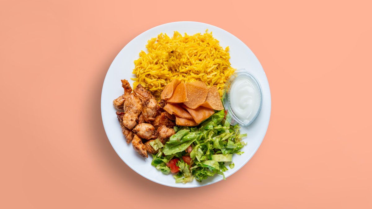шафранов басмати ориз, пилешко месо шаурма, салата фатуш или табуле, пържен арабски хляб, чеснов сос 350г