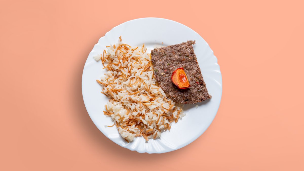 шафранов басмати ориз, телешко мляно месо, табуле или фатуш, пържен арабски хляб, чеснов сос от 350г