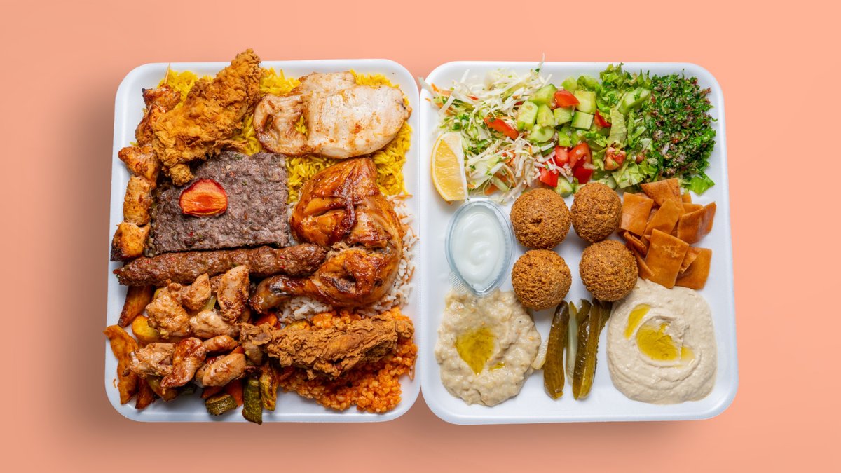 телешко мляно месо кафта, пилешка шаурма, пилешки крилца,пилешко филе, пилешки шишчета или пилешки бутчета бавно печени, фалафел, хумус, мутабал от патладжан, кисели краставици, три вида салати, пържен арабски хляб, чеснов сос, арабски питки и подарък две напитки кен 330мл Coca Cola, Fanta, Sprite , Минерална вода , айрян