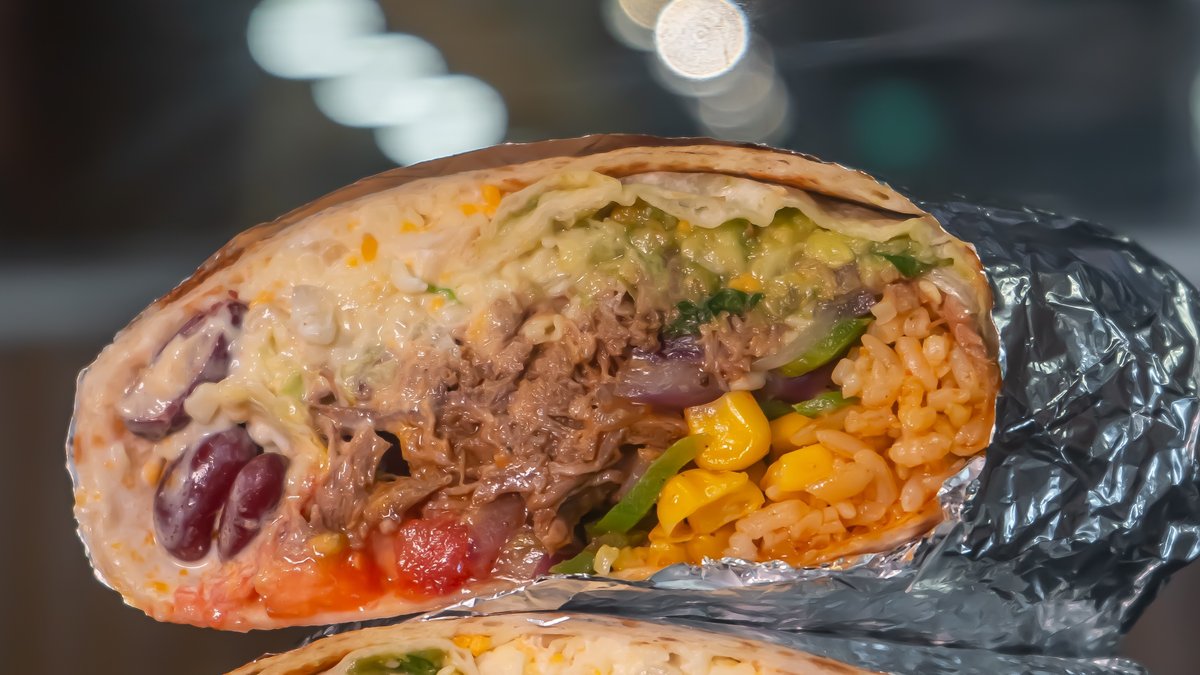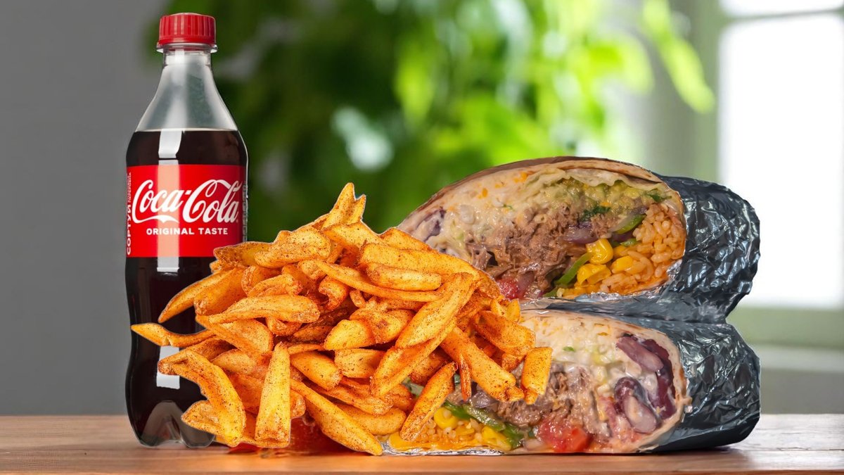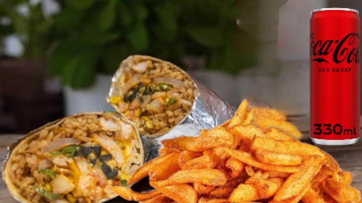 Малко бурито (питка тортила, чушки на плоча, лук на плоча, царевица с подправки, домати, червен боб или маслини, айсберг, кашкавал, сос по избор сервира се студено) + картофки + напитка по избор