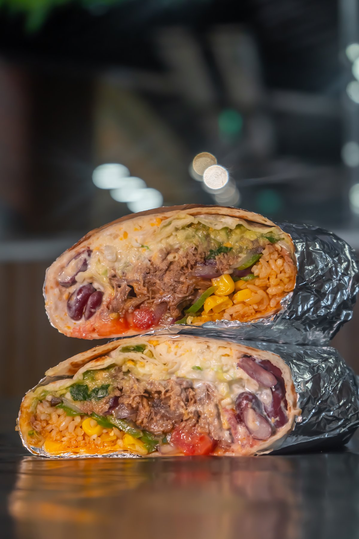 Пилешко или свинско месо, питка тортила, ориз, чушки на плоча, лук на плоча, червен боб или маслини, царевица с подправки, домати, айсберг, кашкавал, сос по избор + картофки _ напитка по избор