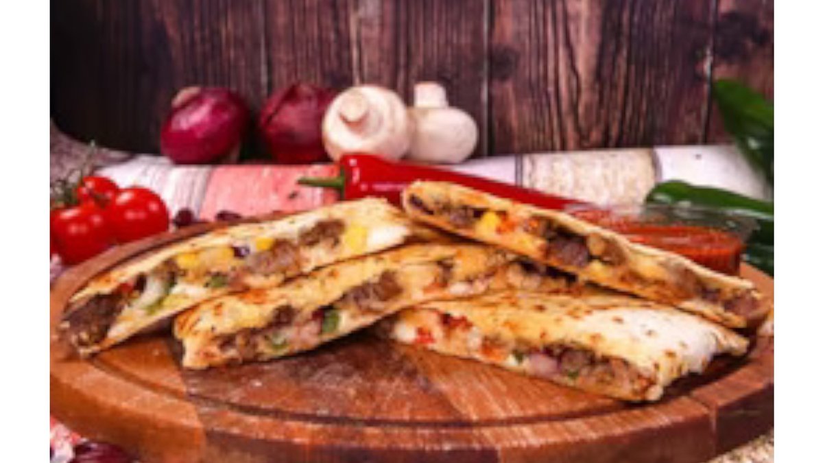 1бр Кесадия (веджи, пилешко, свинско или телешко месо, питка тортила, чушки на плоча, боб или маслини, царевица с подправки, домати, айсберг, кашкавал, сос по избор) + порция картофки + напитка по избор