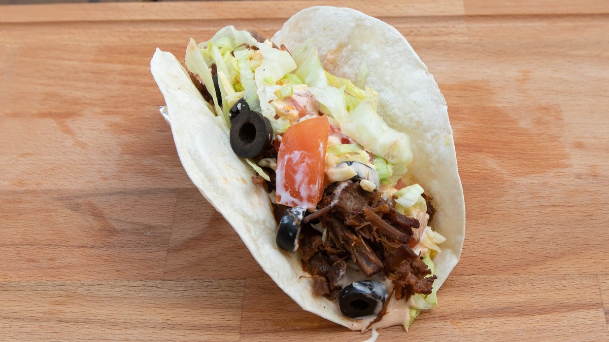 Телешко дърпано месо, питка тортила (2бр), чушки на плоча, боб, царевица с подправки, домати, айсберг, кашкавал, маслини, сметанов сос или люта салца по желание