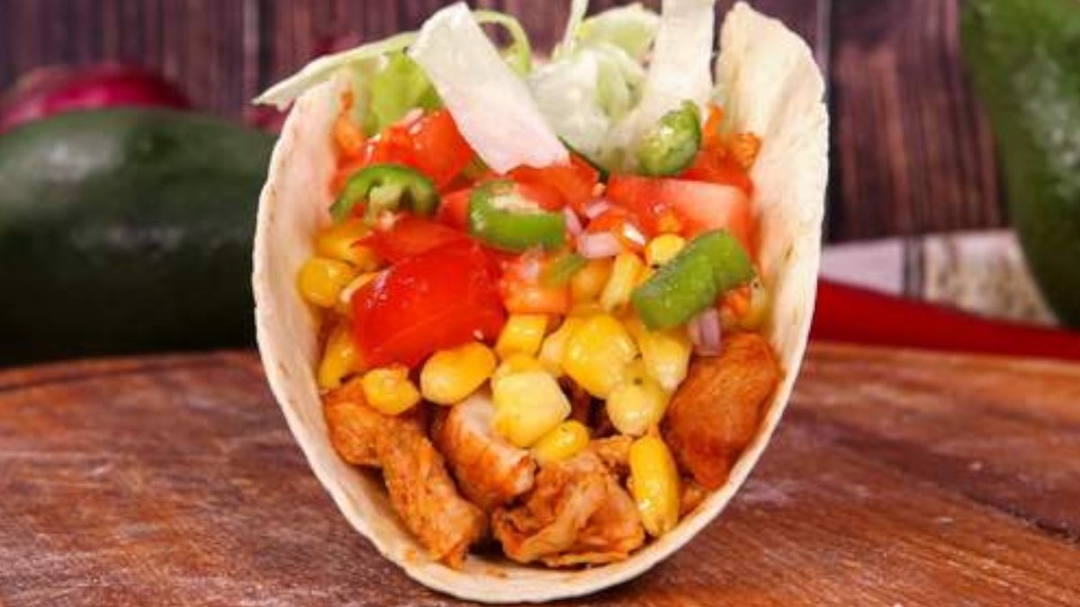 Питка тортила, чушки на плоча, лук на плоча, царевица с подправки, домати, червен боб или маслини, айсберг, кашкавал, сос по избор сервира се студено
