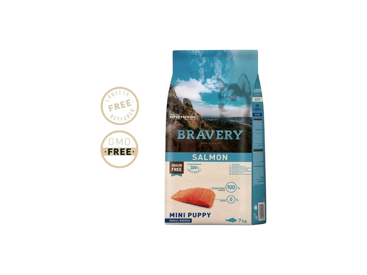 Насипна храна, Bravery Salmon Mini Breeds Puppy - Пълноценна храна подрастващи кученца от дребни и мини породи със сьомга 7 кг