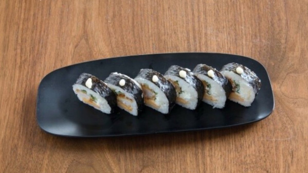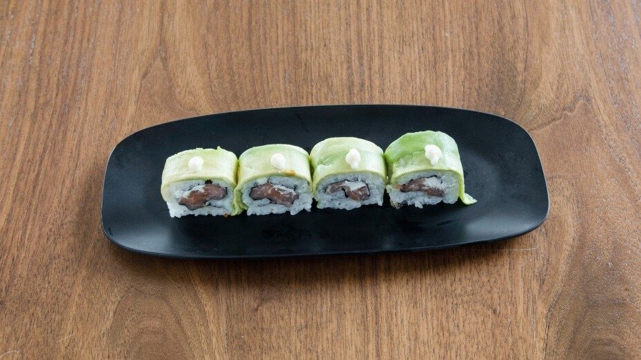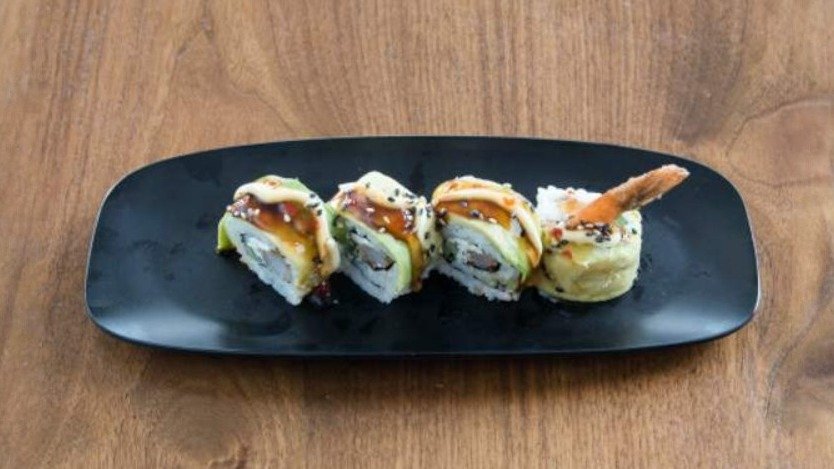 филаделфия, краставица, скарида темпура авокадо, майонеза, унаги, сладко чили, сусам