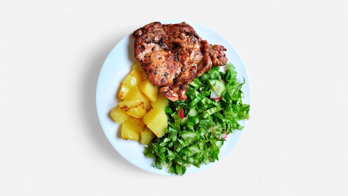 Пилешка пържола на скара с печени картофи и зелена салата