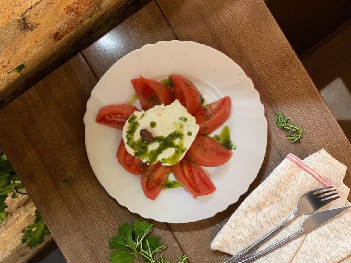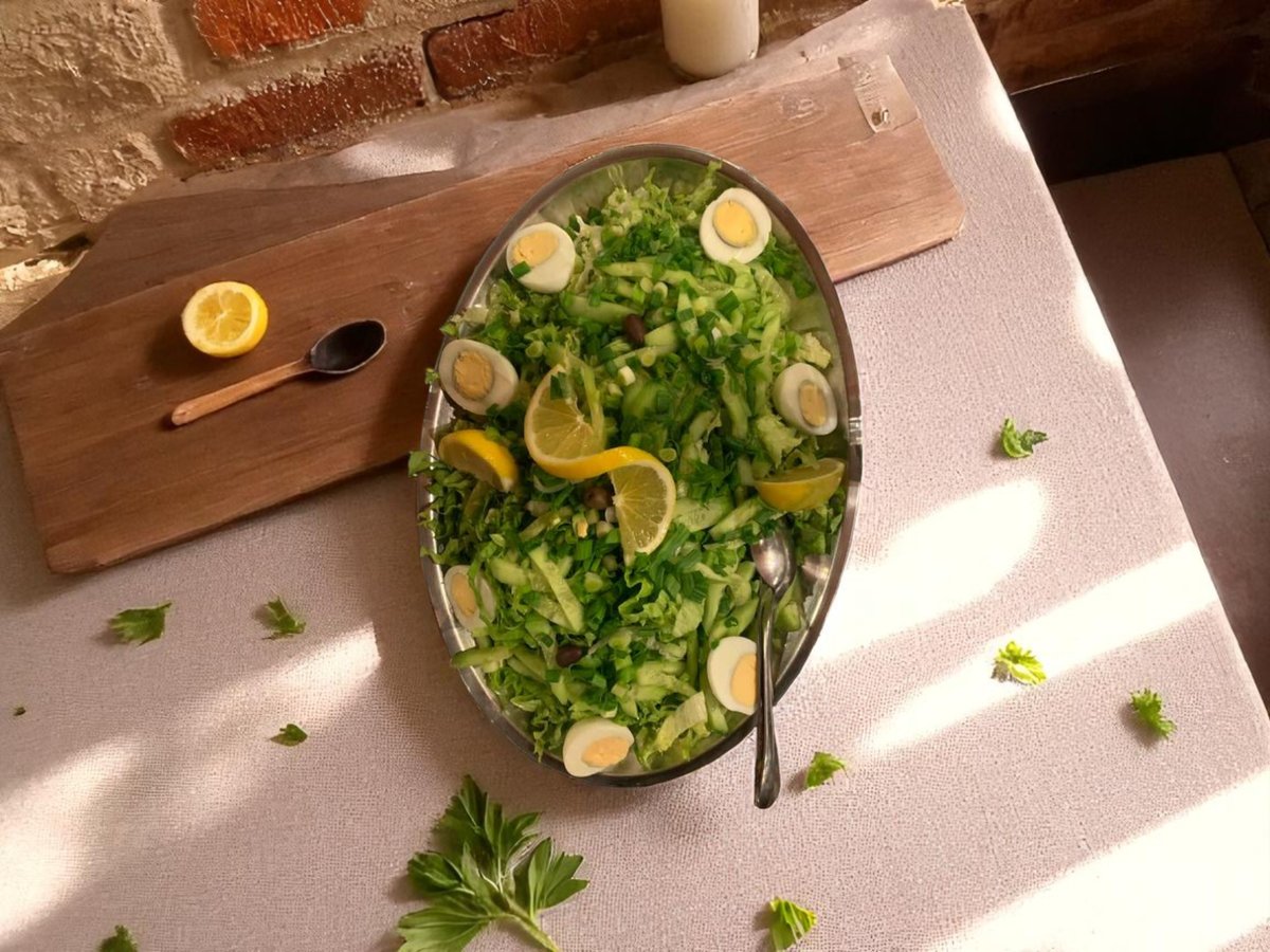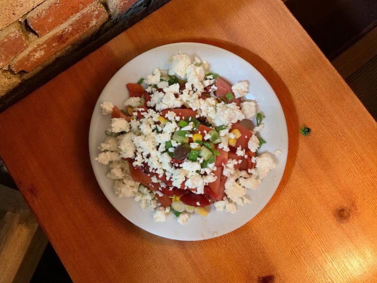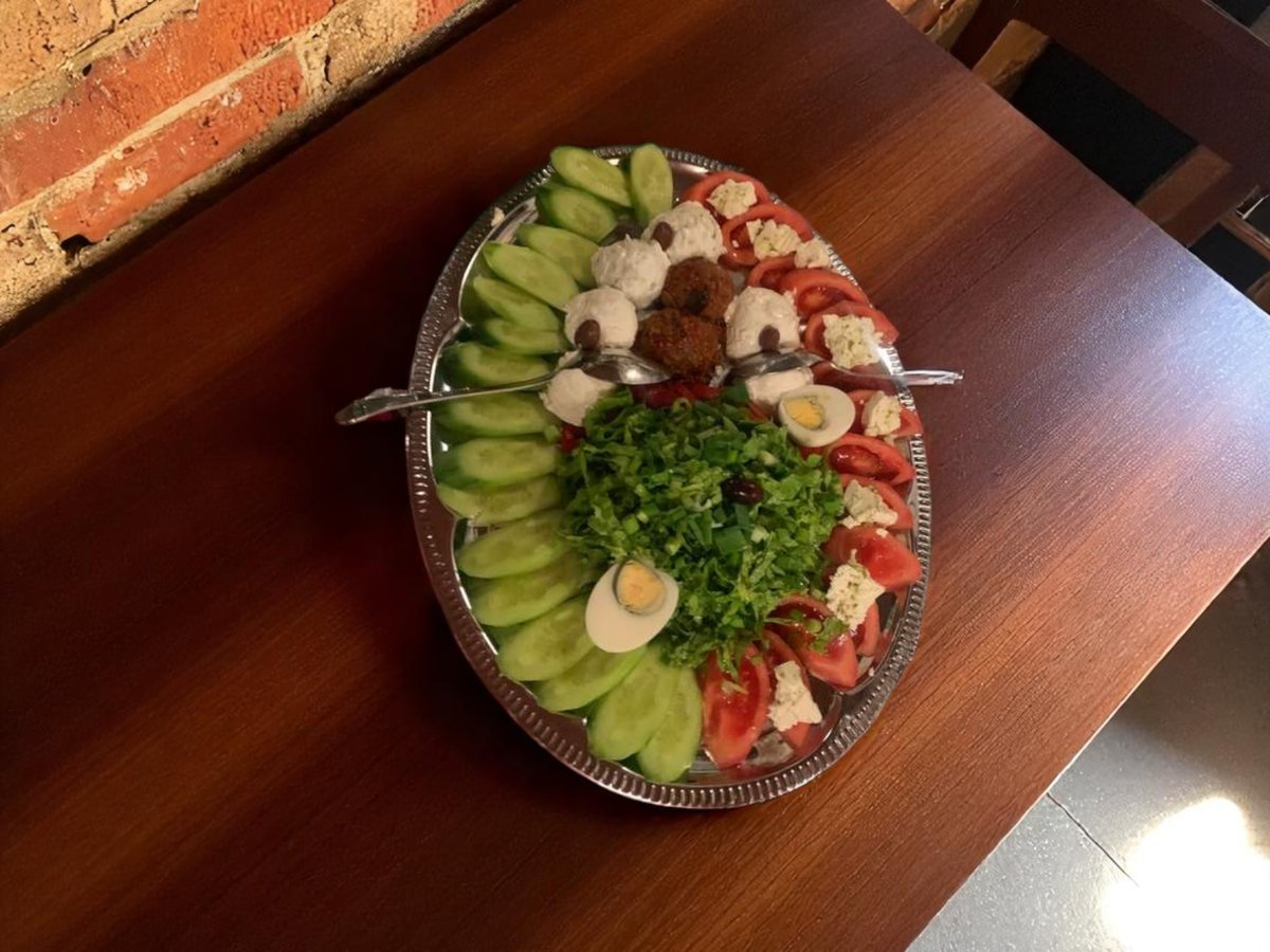 зелена салата, белени домати с прясно сирене, яйце, краставици, печени чушки, кьопоолу, катък, тракийска салата, павлак, яйце 1500г