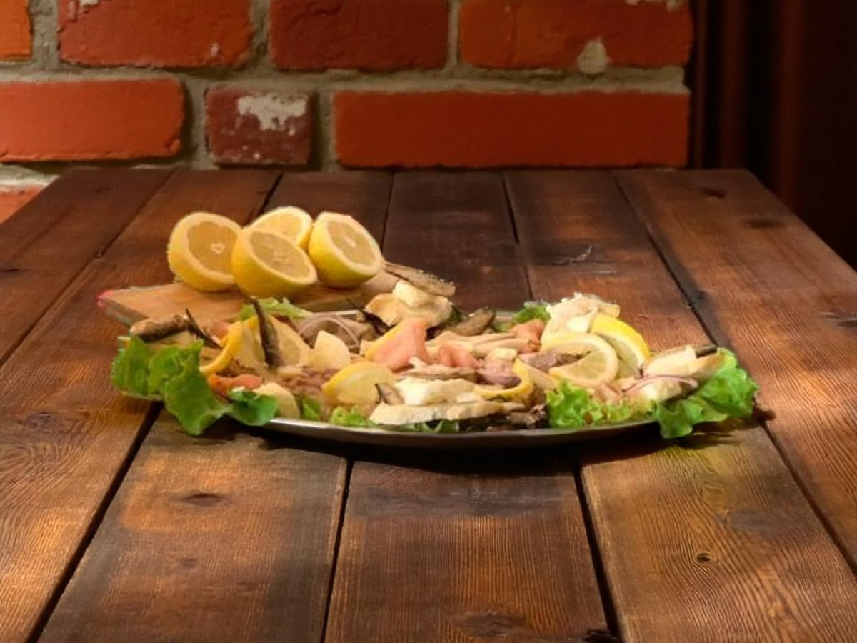 сьомга, пушена пъстърва, сельодка, дроб от треска, шпроти, червен лук, масло, лимони, брускети, каперси 800г