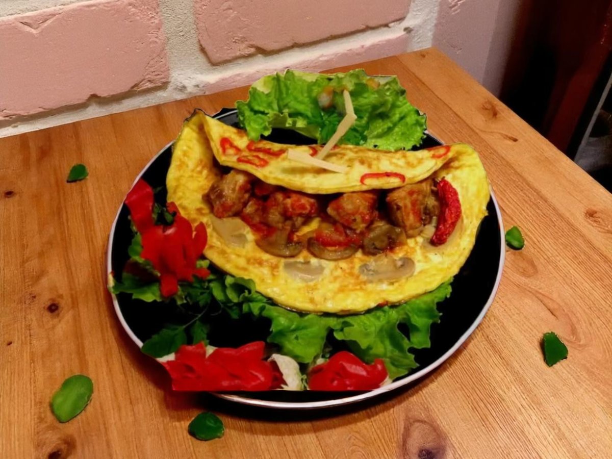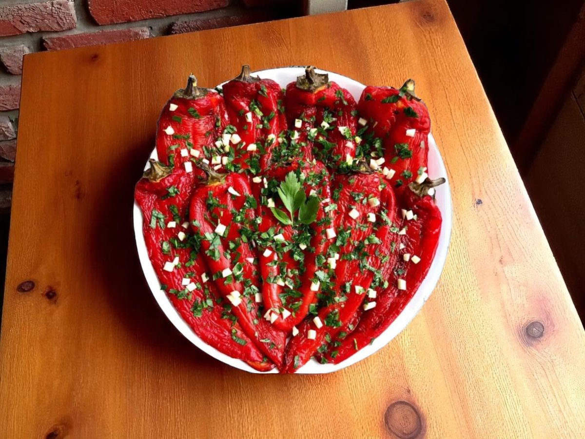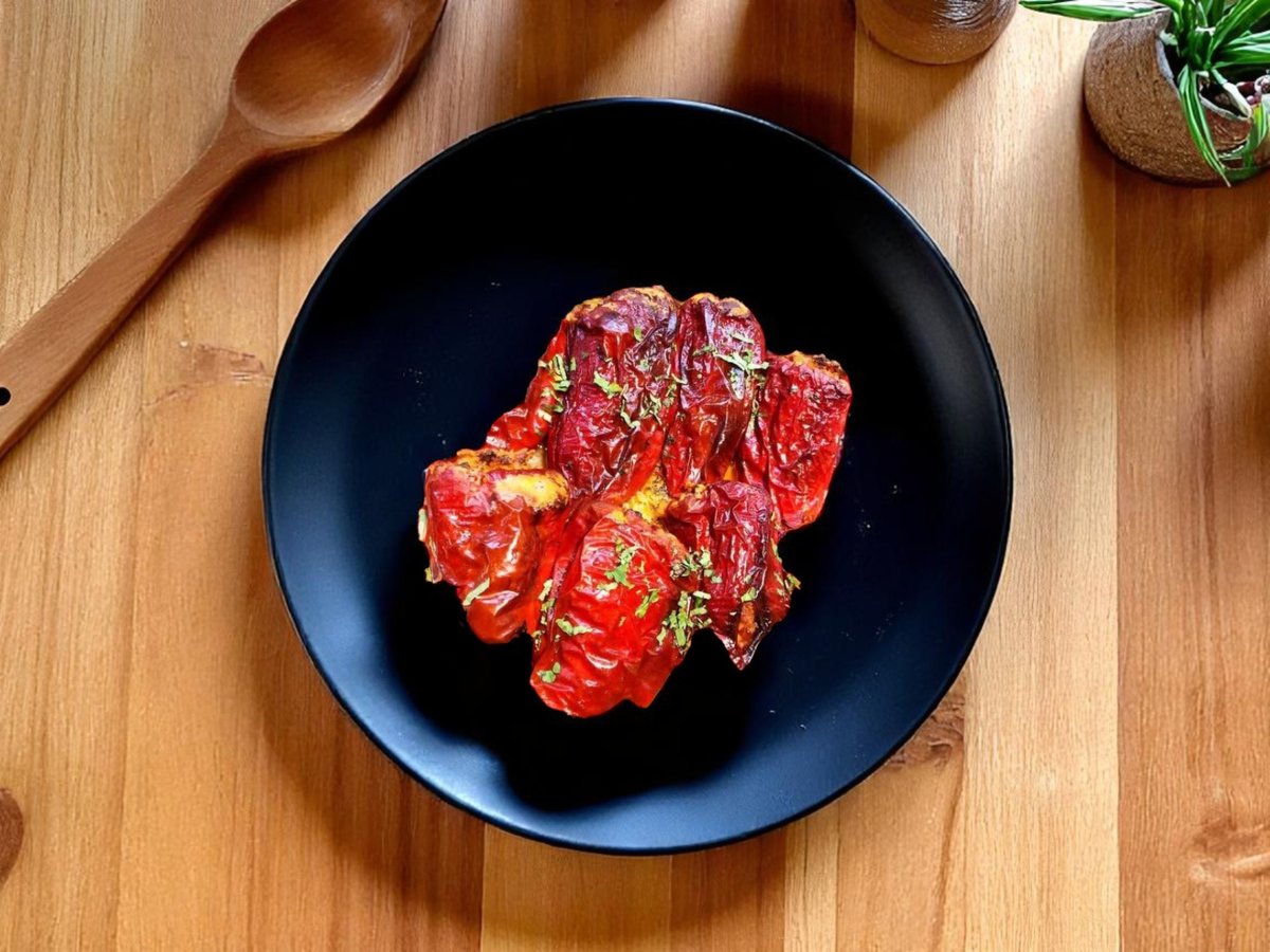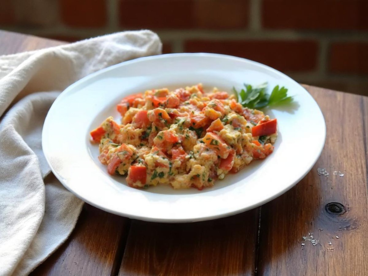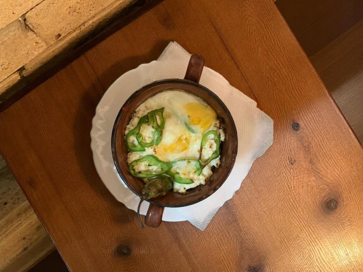 печени чушки, домати, стар лук, краве сирене, яйца и магданоз 300г