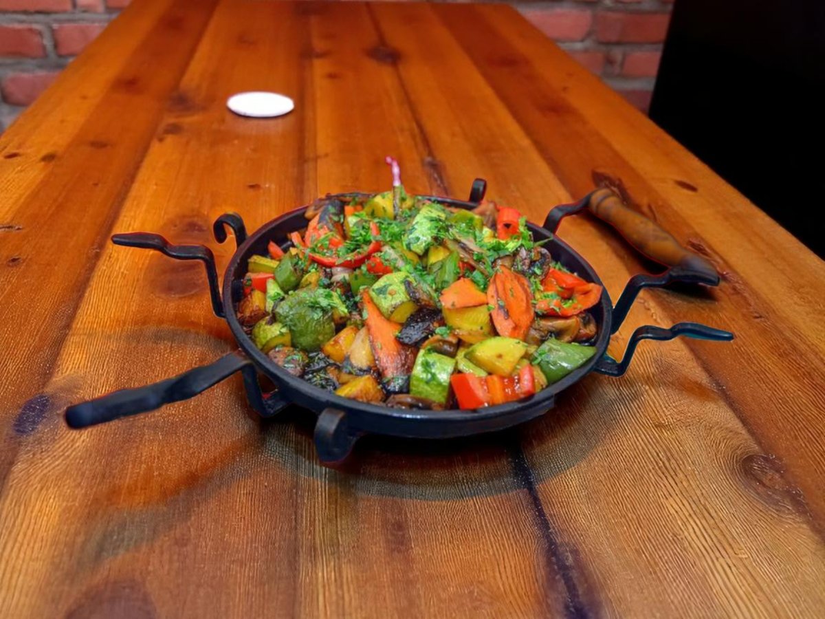 телешко филе, телешки суджук, зеленчуци върху пикантни картофи 600г