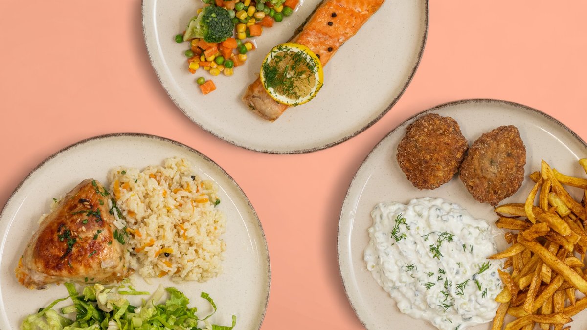 пържени кюфтета 70г / 2бр, гарнитура по избор, салата по избор, десерт по избор