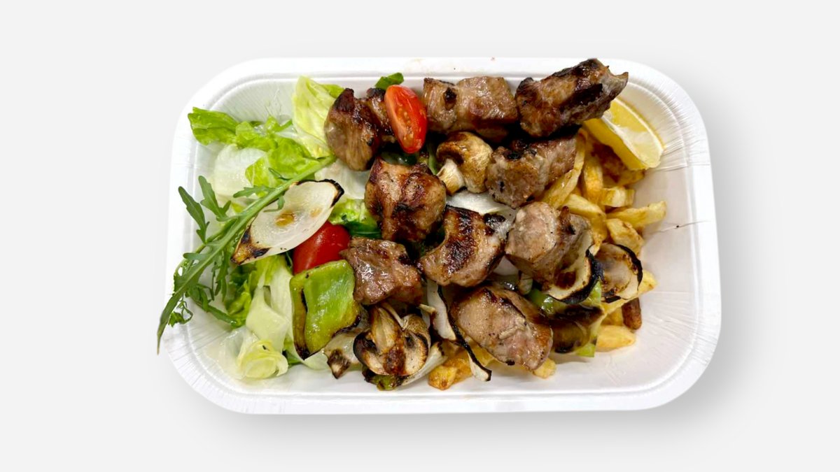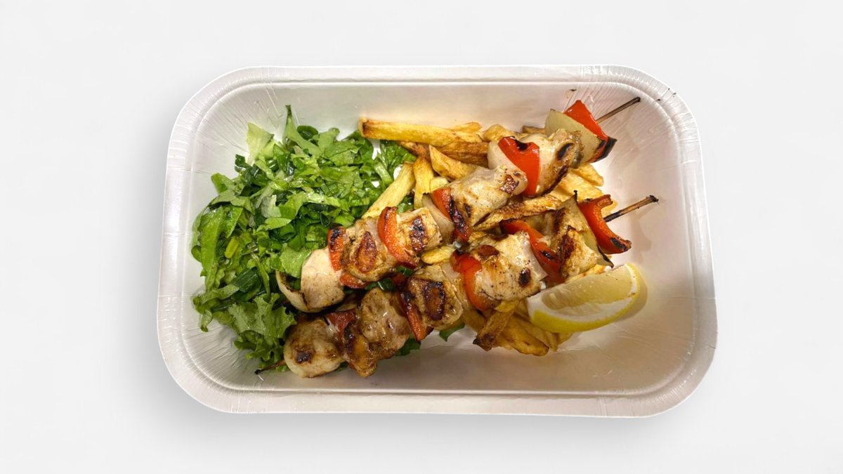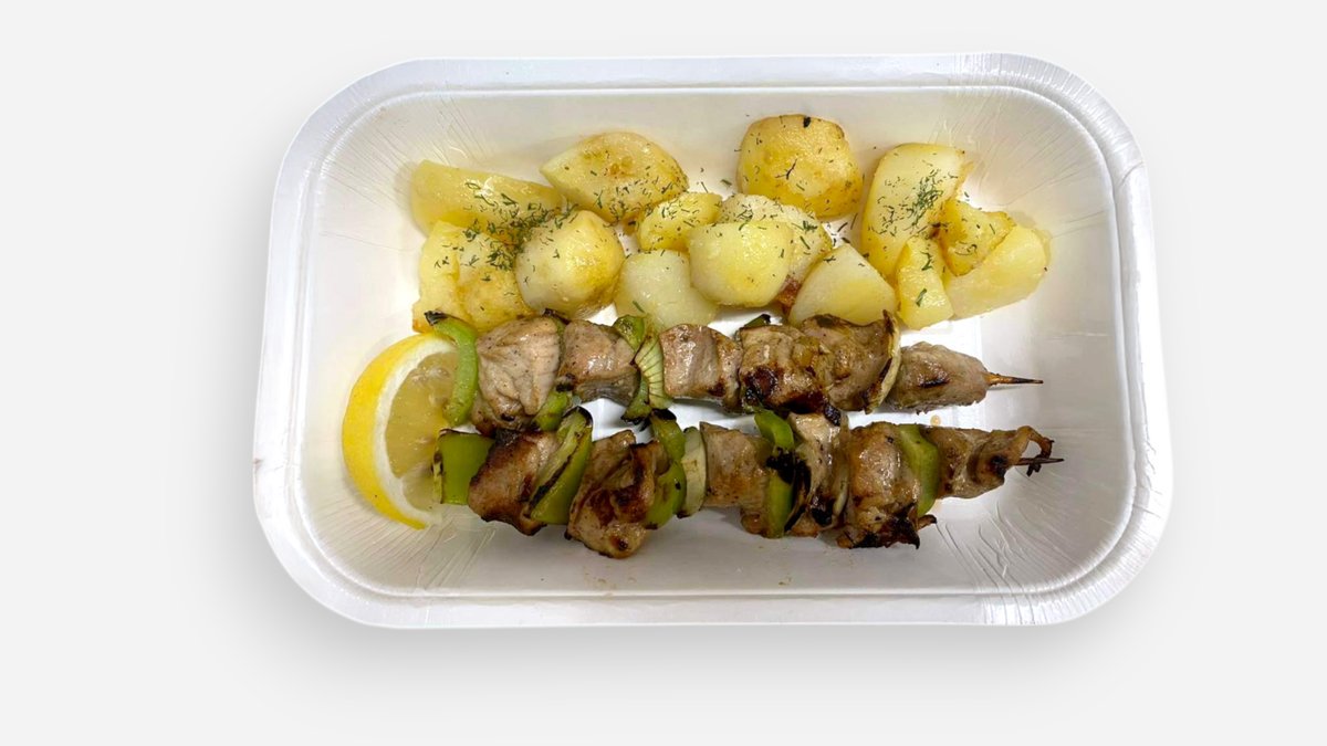 мариновани късчета от свинско, пилешко и суров суджук, гарнирани с лютеница и пържени картофки 450г