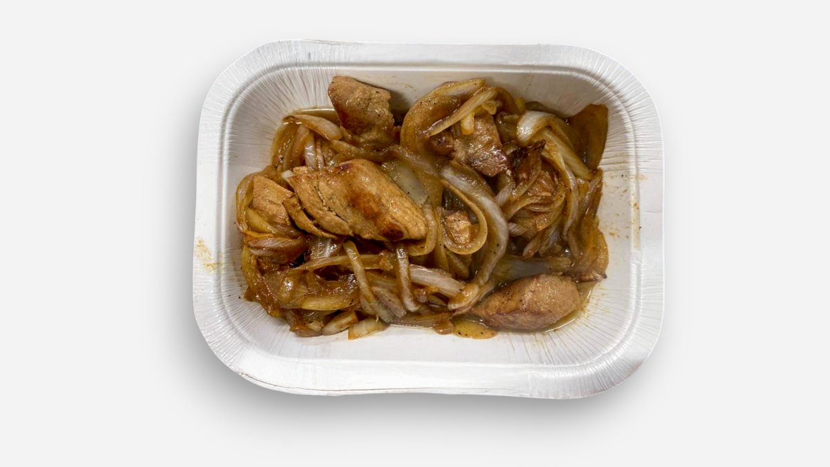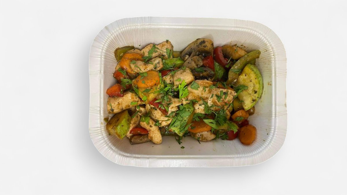 пилешко месо, лук, гъби, и чушки, гарнирани със салата зеле и пържени картофи 500г