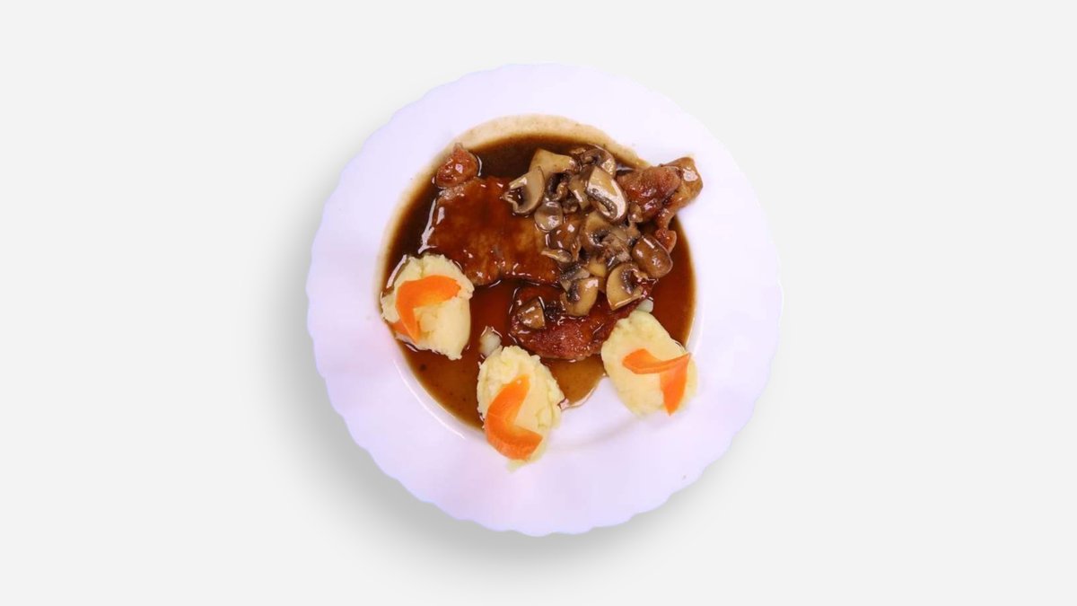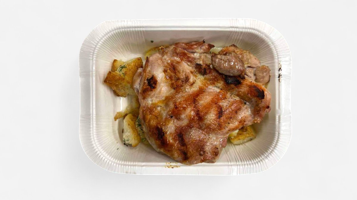 свински врат, лук, гъби, чушки гарнирани с микс салата и пържени картофи 500г