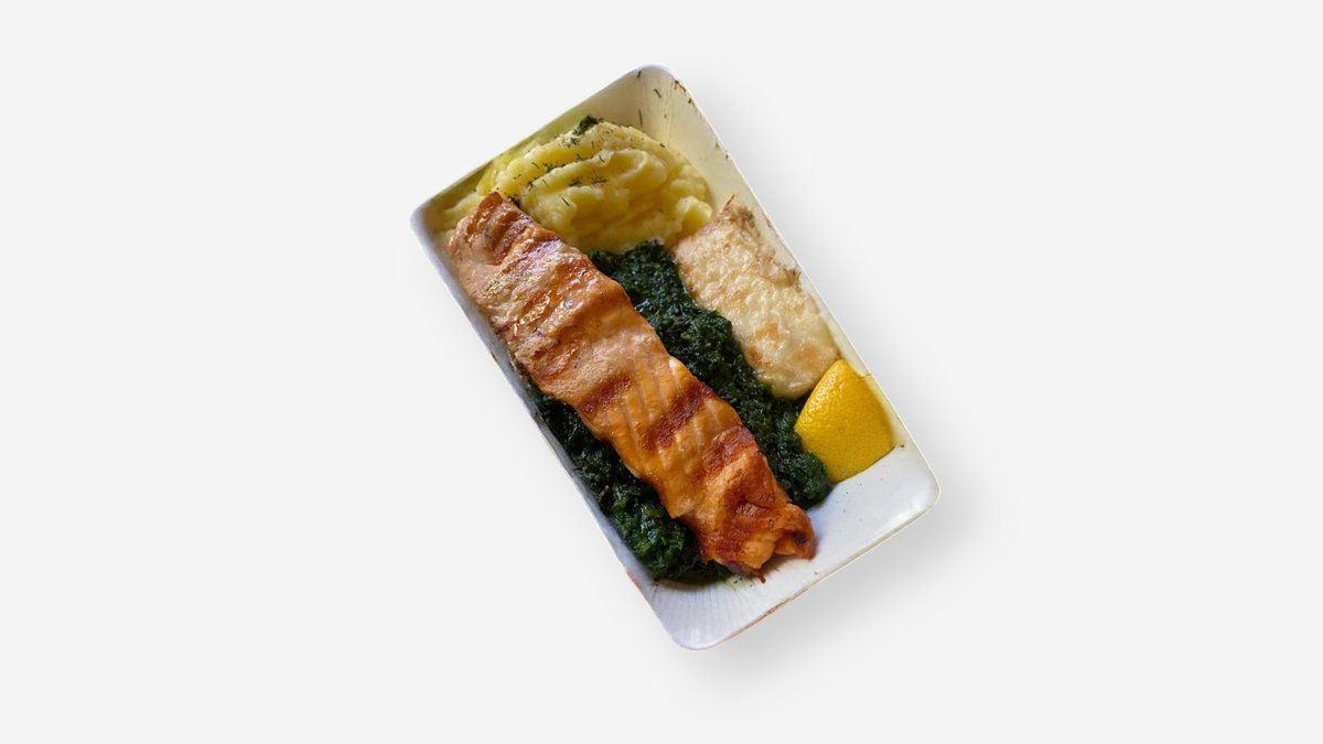 сьомга на плоча с дип от сирена, спанак и картофено пюре 380г