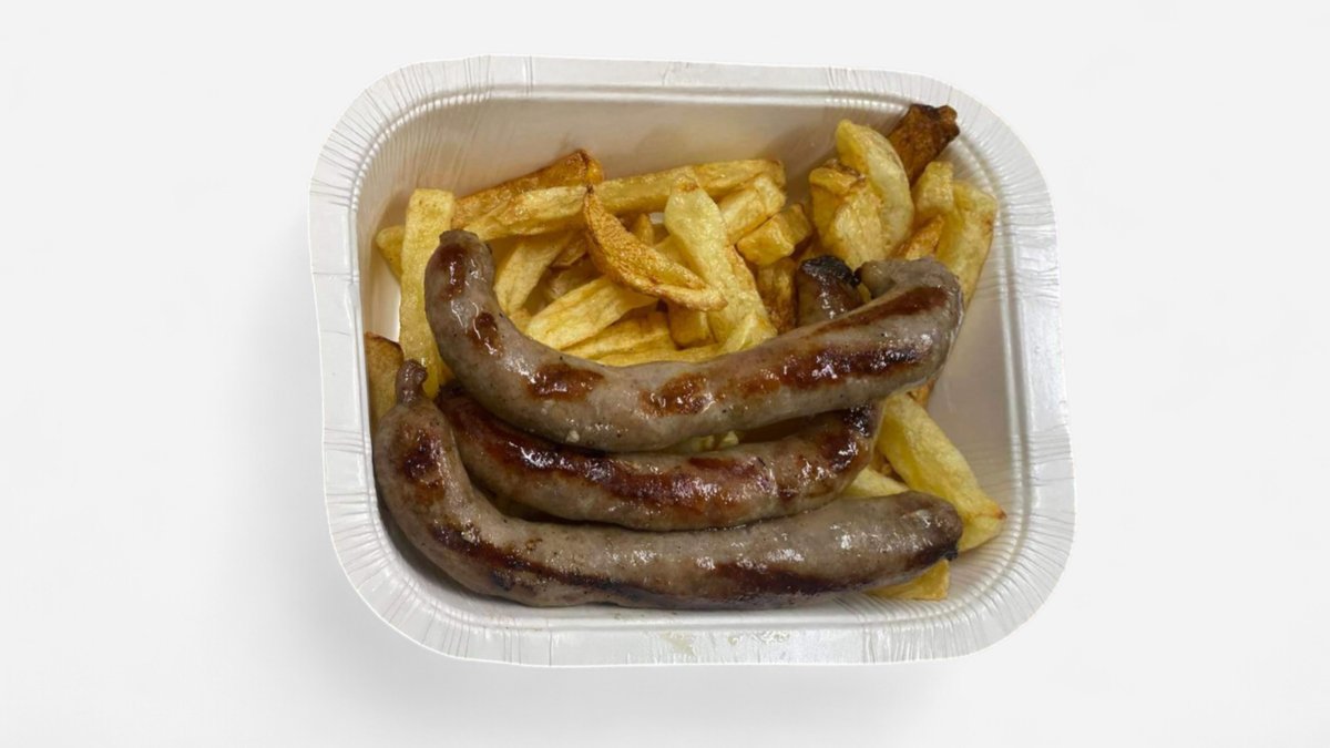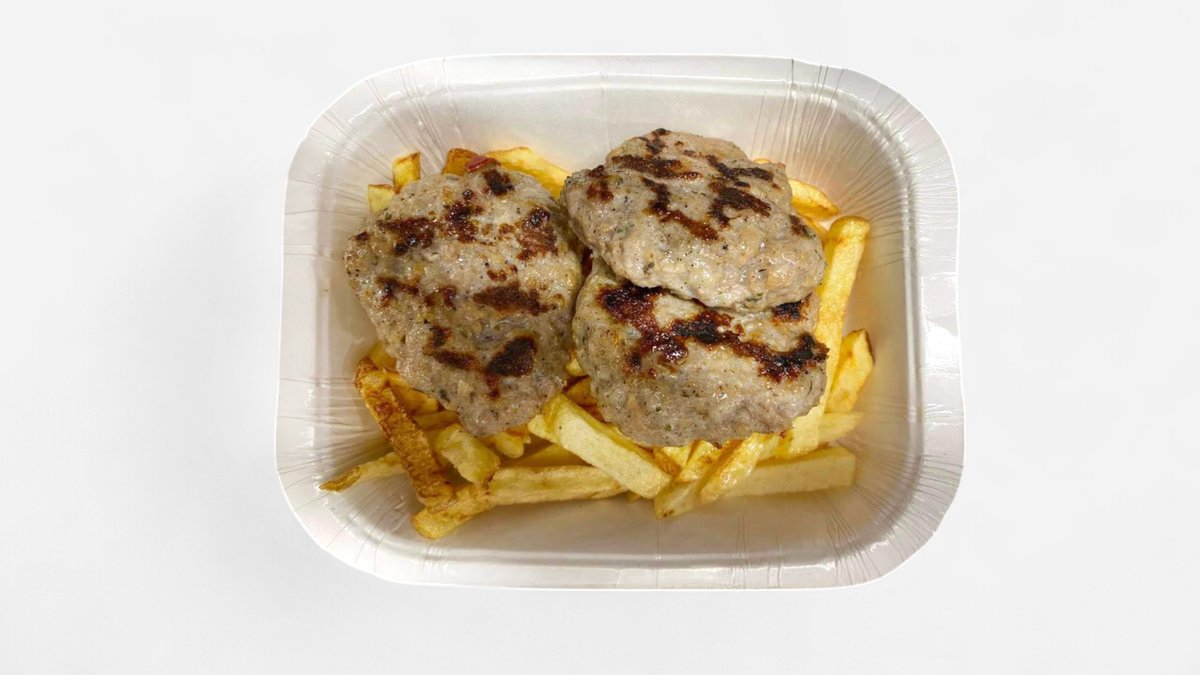 Наденички по селски с пържени картофи и лютеница