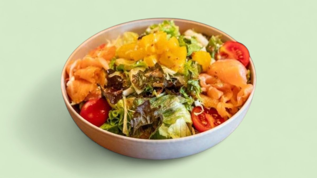айсберг, зелена салата, чери домати, краставици, пушена сьомга, чътни от ананас, кориандър и дресинг от мед и лимон 300г