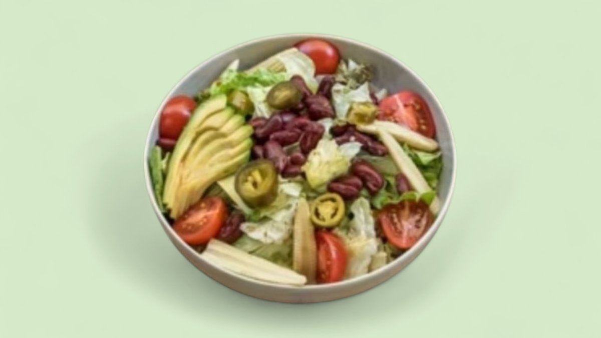 черен боб, маринован червен лук, халапеньос, доматен сос, айсберг и Чедър сирене, гарнирано с ориз и пържени картофи 450г