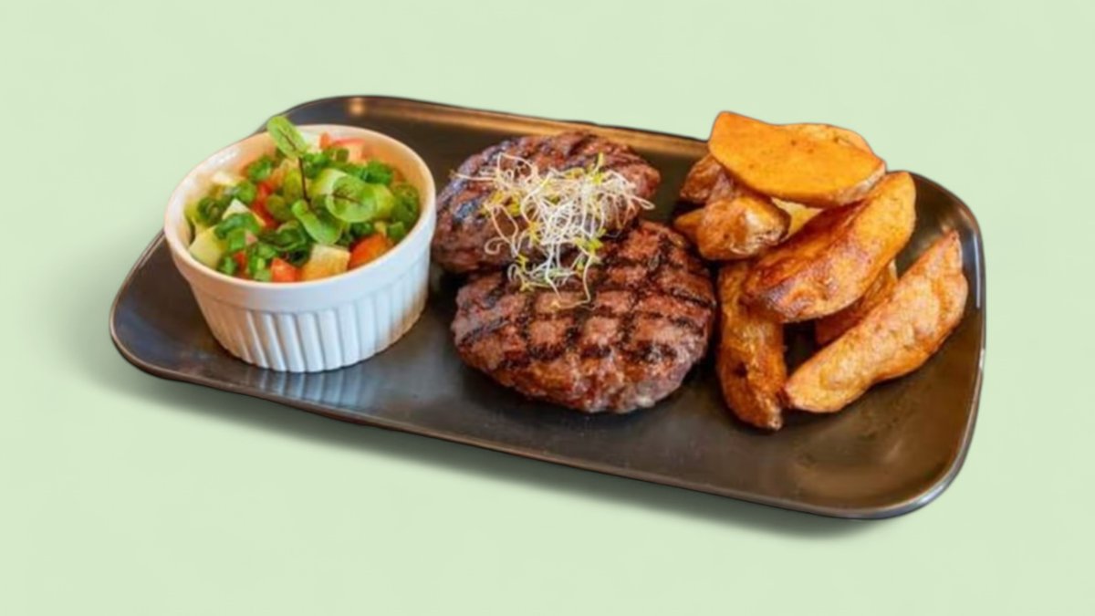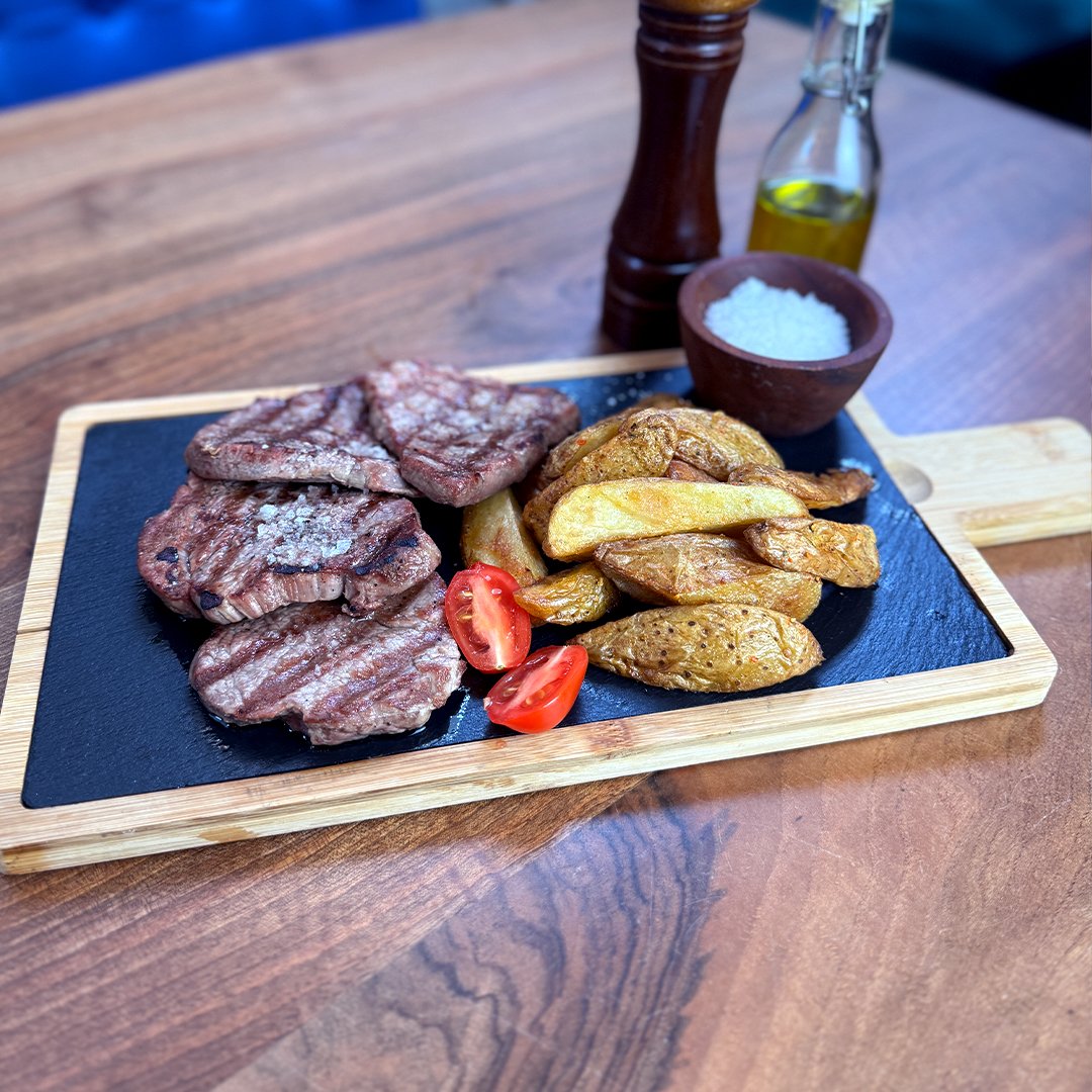 Black Angus кюфтета с домашни картофи и салата от ситно нарязани домати и краставици 450г