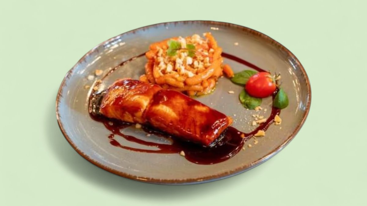 филетирана сьомга с терияки сос, карамелизирани бейби моркови и лешници 280г