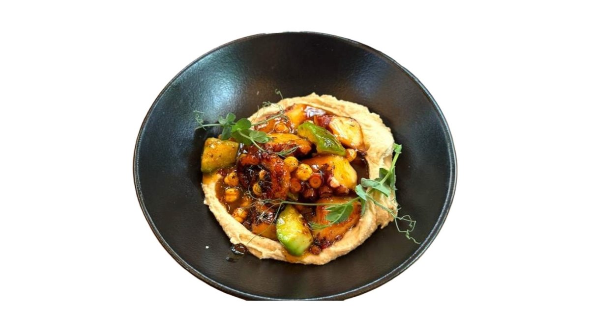 грилован средиземноморски октопод, хумус от червена леща, перли от нахут, авокадо и чили 300г
