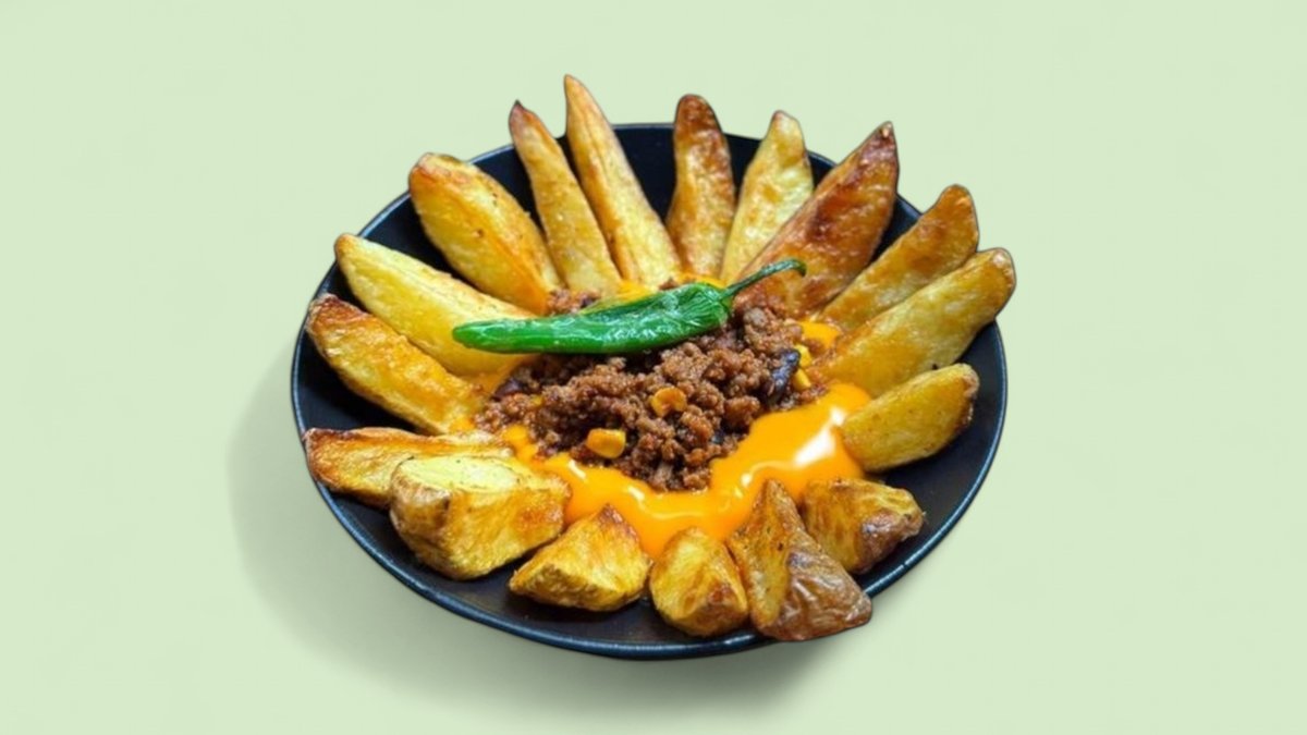 Пържени картофи поднесени със сос Чедър сирене и телешка кайма