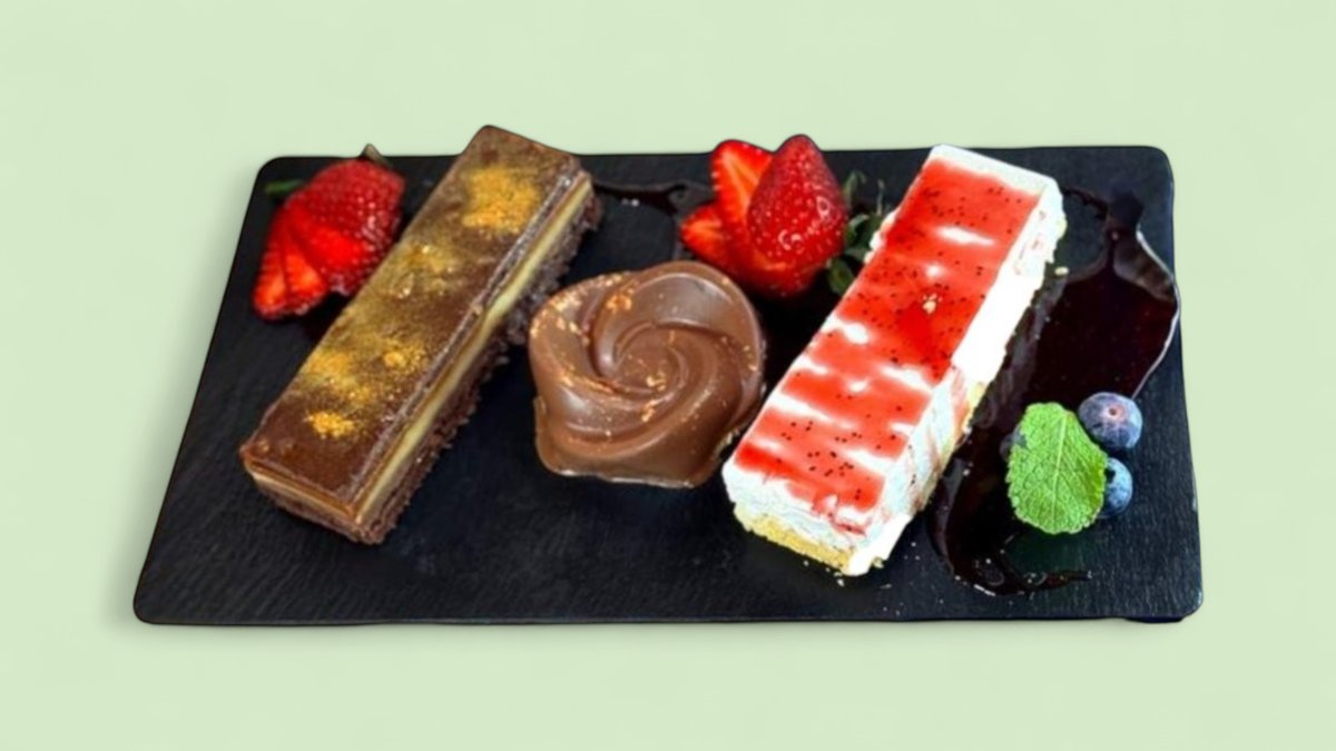 десерт от 7 вида шоколад, перуански чийзкейк манго, дубайски шоколад 400г Имайте предвид, че в ястието има какаови зърна, които може да включват следи от (различни) ядки.