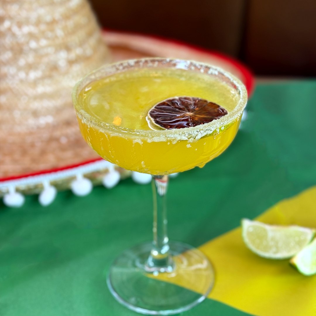 Златна текила Олмека, ликьор Коантро, фреш лайм, плодово пюре Манго, натрошен лед / 500мл.