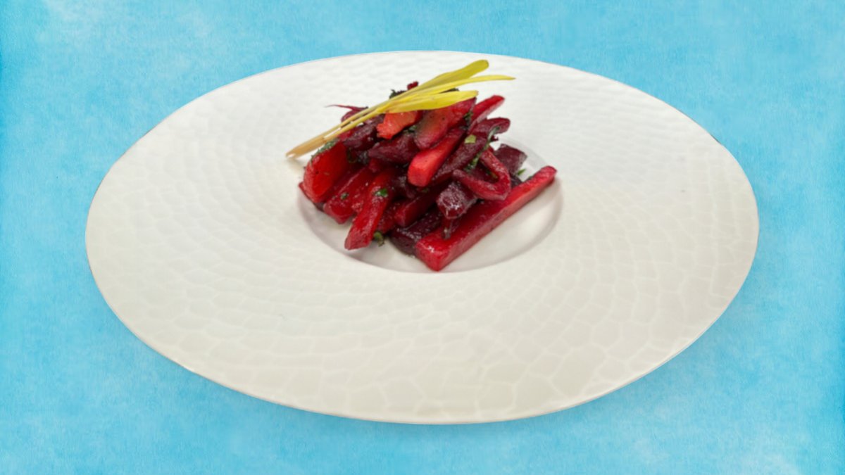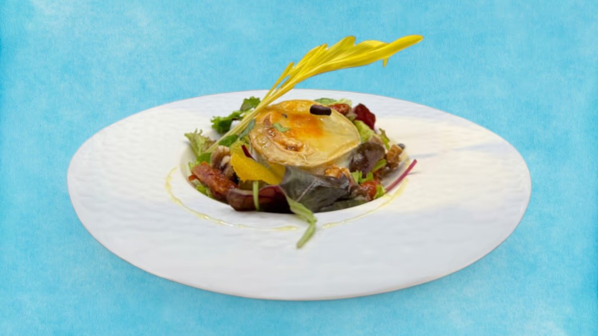 Запечено козе сирене Бетине с благородна плесен в акомпанимент на сушени домати, филиран портокал и орехи, дресиран листен микс със Сеинт Клемент и топирано с натурален пчелен мед, 280г