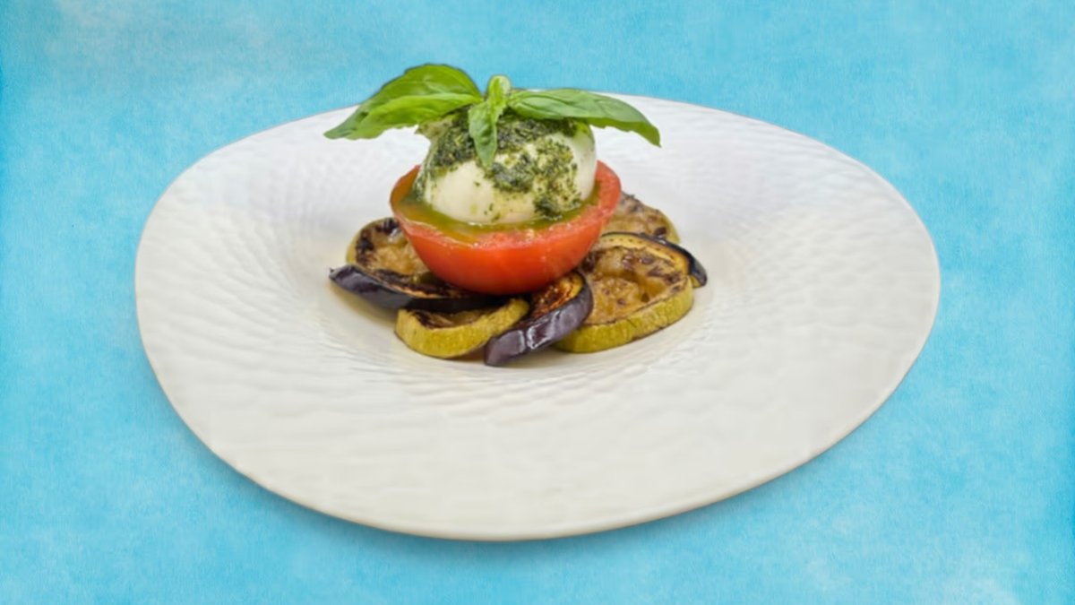 Патладжан и тиквички на грил, свежи домати, кремообразна Бурата от Пулия, босилек, балсамико и зехтин, 360г