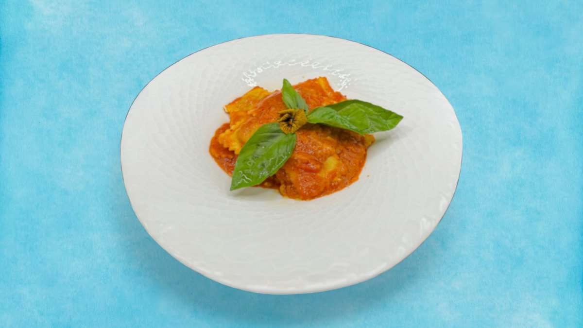 Домашно приготвена паста равиоли с рикота и спанак и леко пикантният сос Арабиата от натурални продукти завършена със сирене рикота, 300г