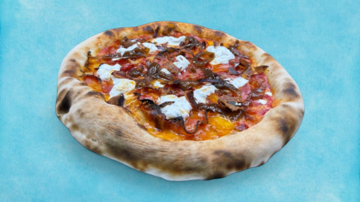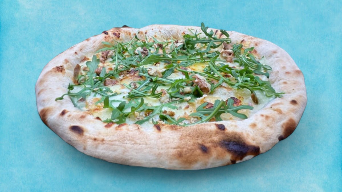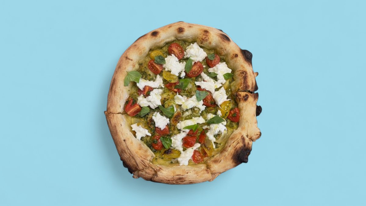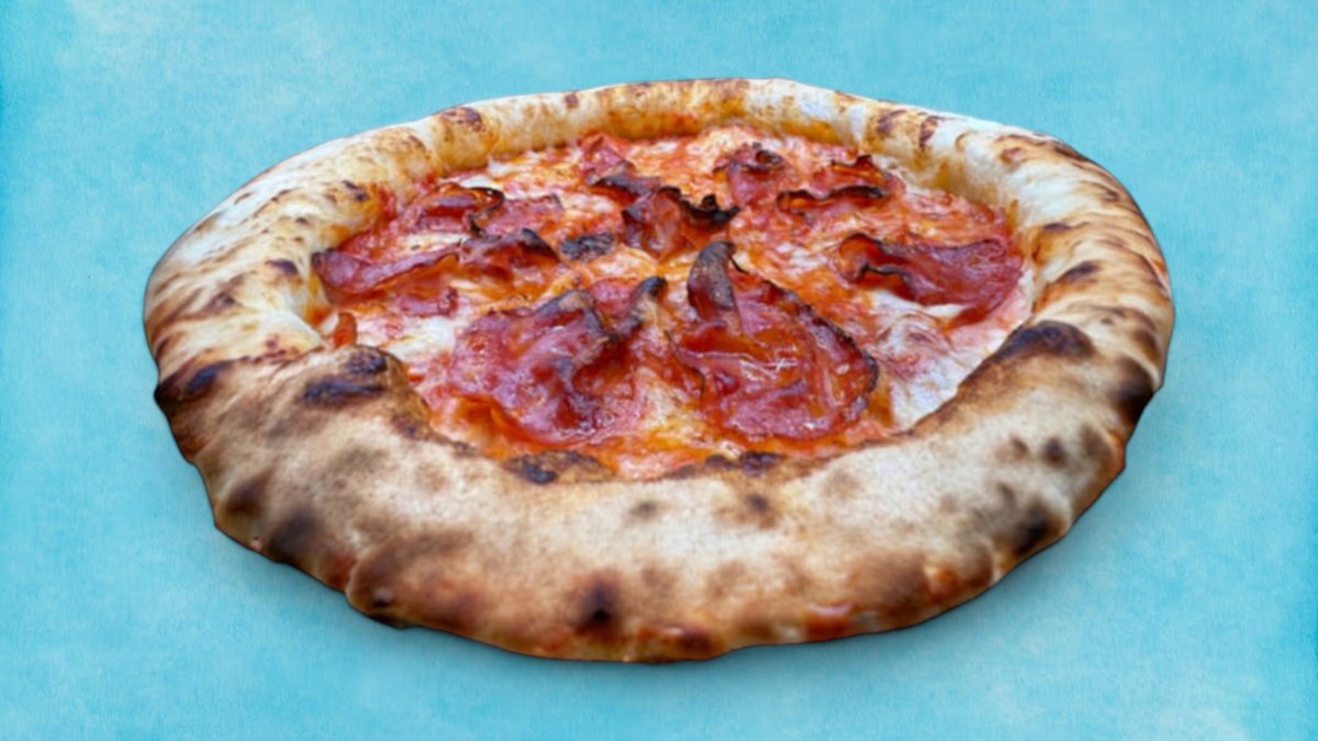 Тук приготвеният наш доматен сос от Сан Марцано моцарела и пикантен салам Вентричина от регион Абрузо завършена със сирене страчатела регион Пуля, карамелизиран лук и чипс от панчета регион Ломбардия, 400г