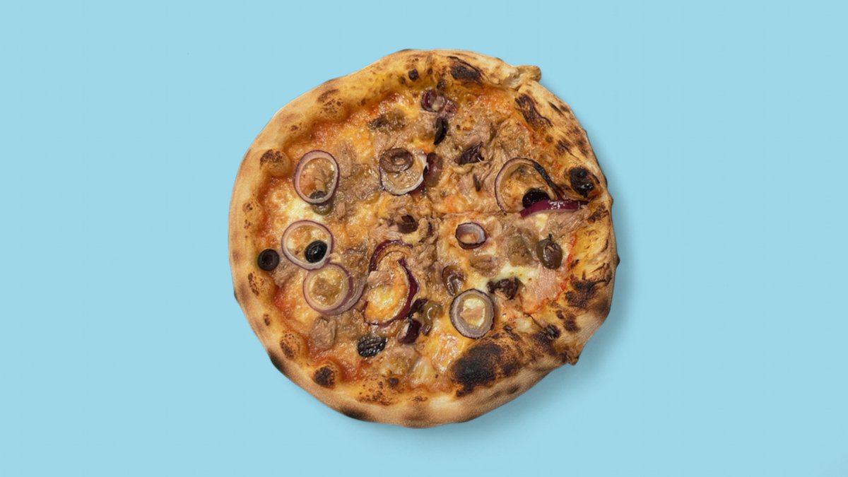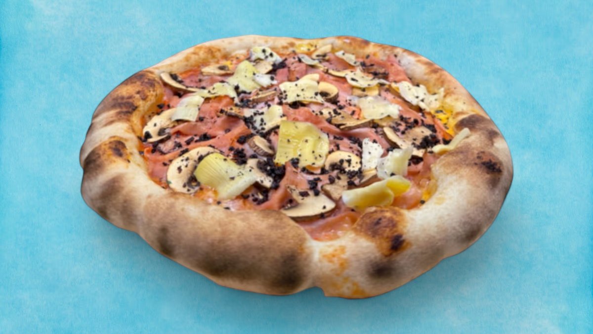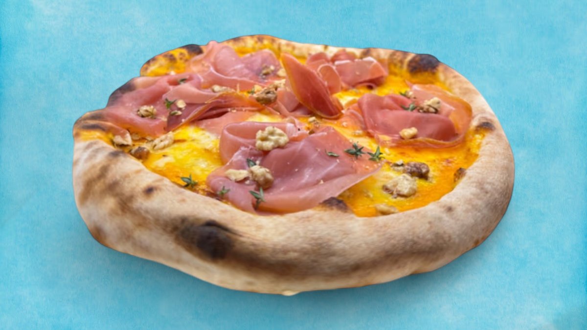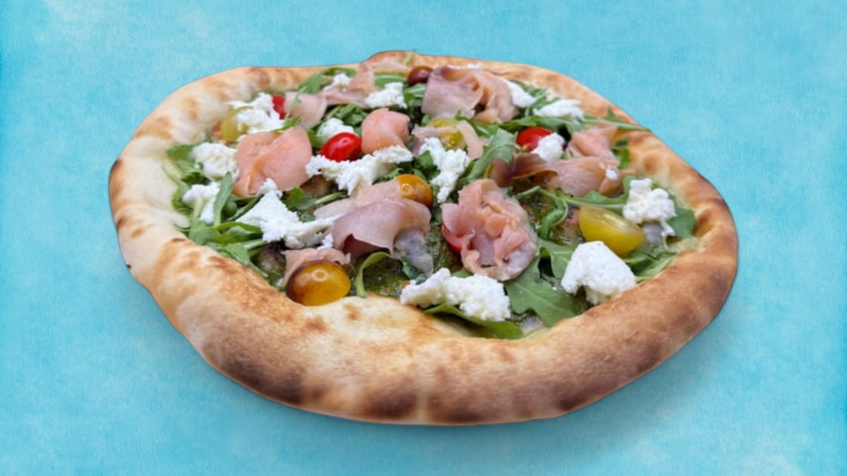 Тук приготвеният наш доматен сос от Сан Марцано моцарела и пикантен салам Вентричина от регион Абрузо завършена със сирене страчатела регион Пуля, карамелизиран лук и чипс от панчета регион Ломбардия, 400г