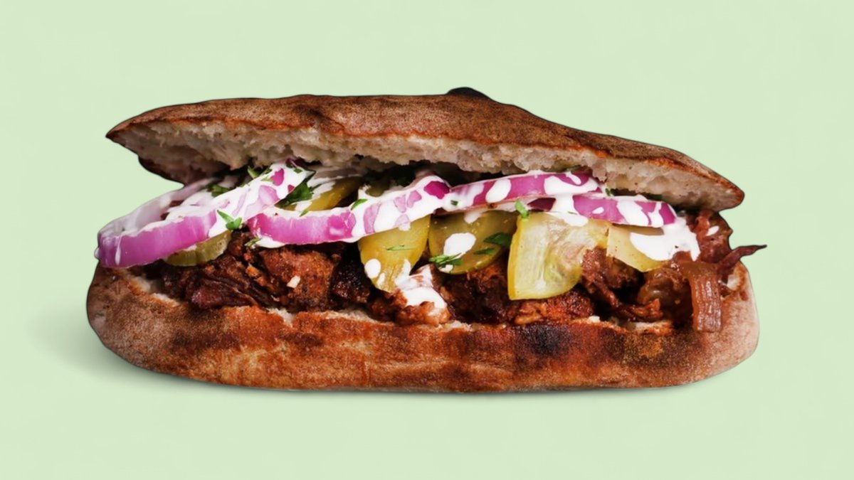 панино, дърпано телешко месо, кисели краставички, майонеза, червен лук, магданоз, млечен сос, 350г