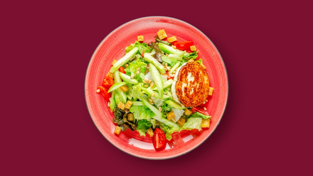 с хаус дресинг, запечено козе сирене, чери домати, краставици, кедрови ядки и крутони 350г