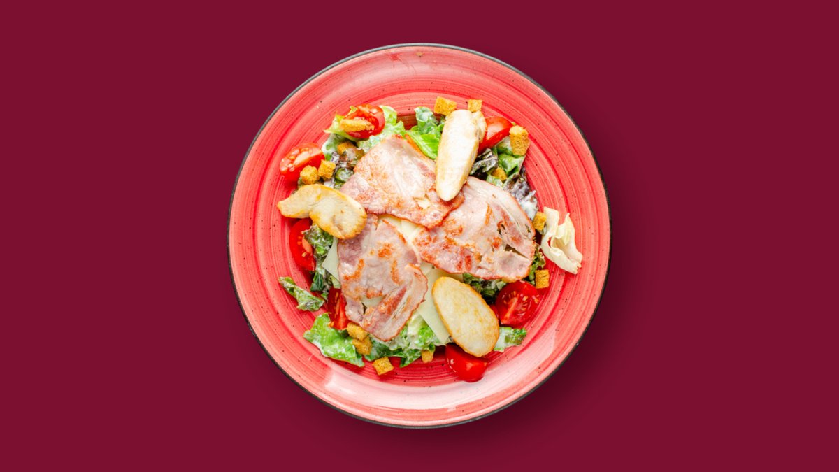 микс салати, цезар сос, чери домати, запечен бекон, пилешко филе, Пармезан и крутони 300г