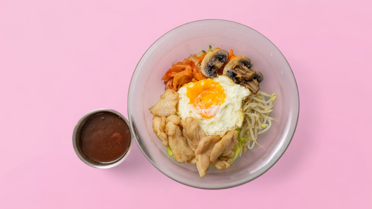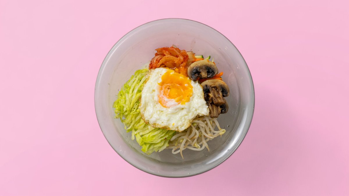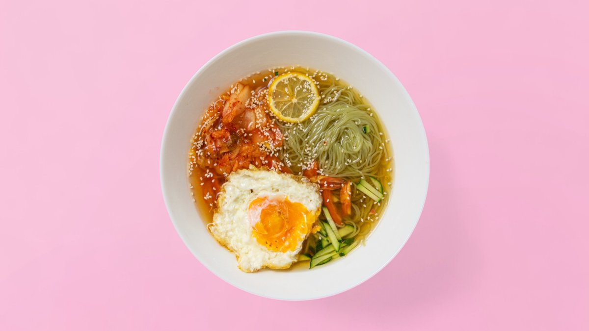 Студени спагети със студен сос, яйце, краставици и кимчи