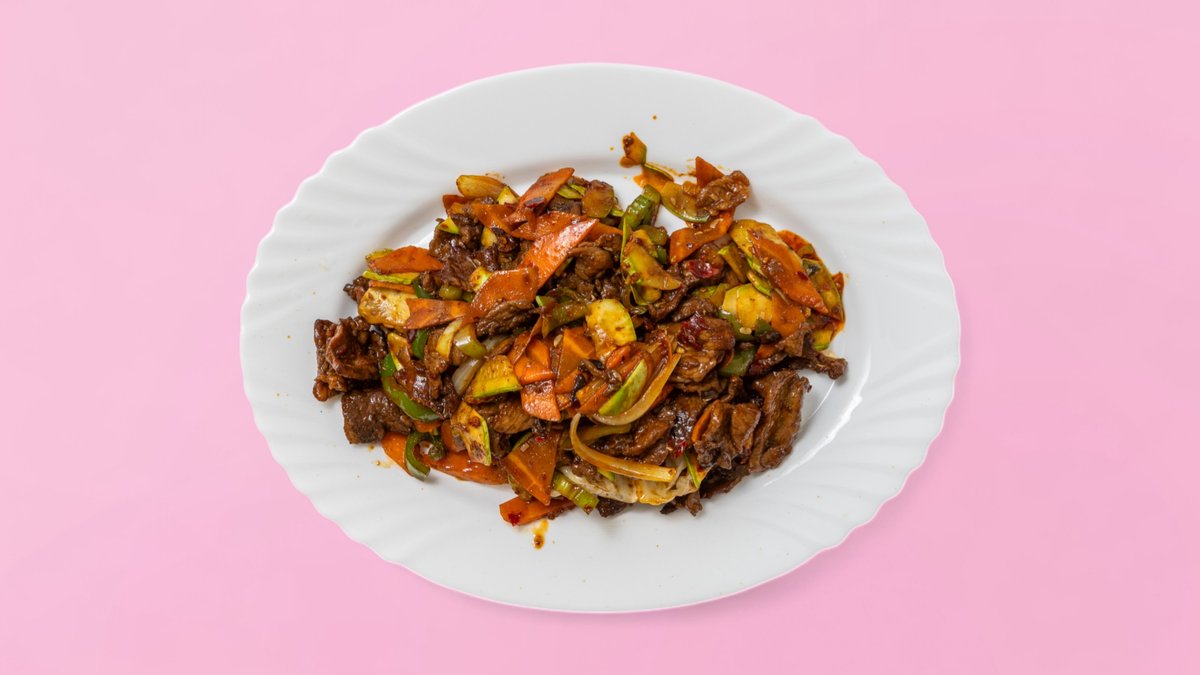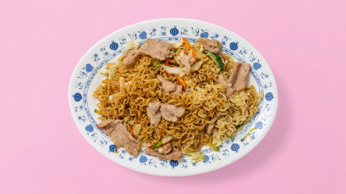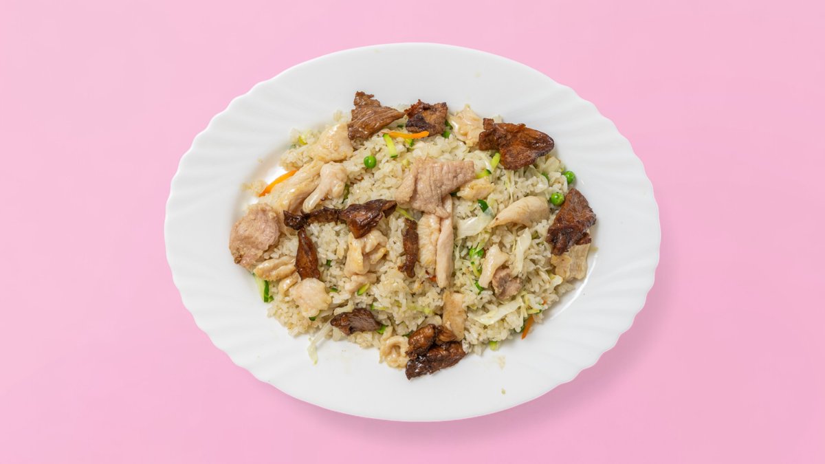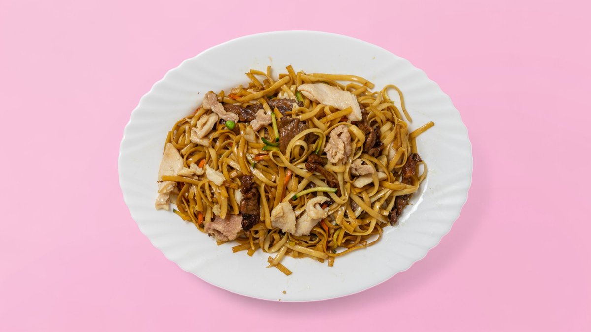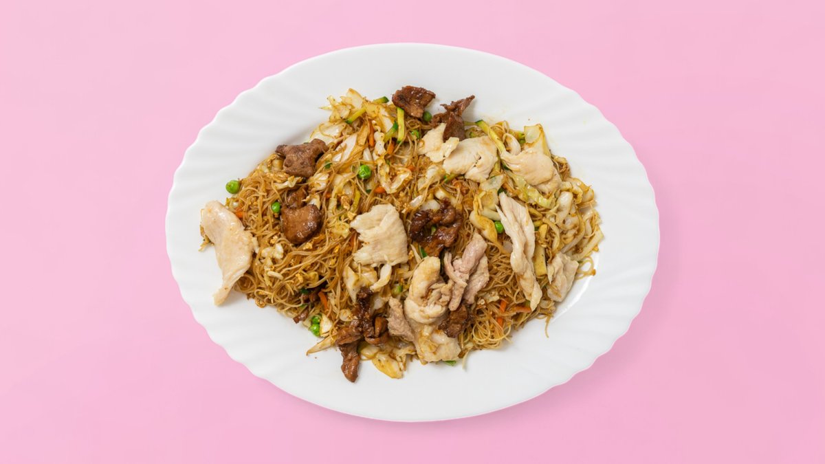 1731. Пържени оризови спагети с три вида месо, зеленчуци с яйца