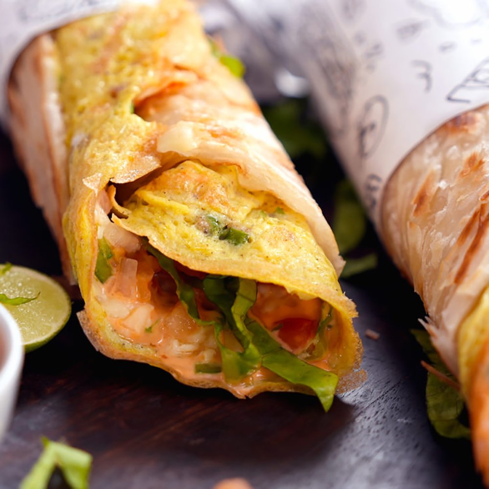пикантно яйчено руло е индийска улична храна. Омлет, зеленчуци и кориандър чътни (сос), увити в мек и топъл парата хляб, е идеално хапване за път, 1 брой
