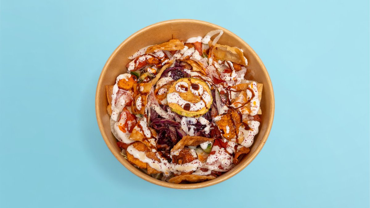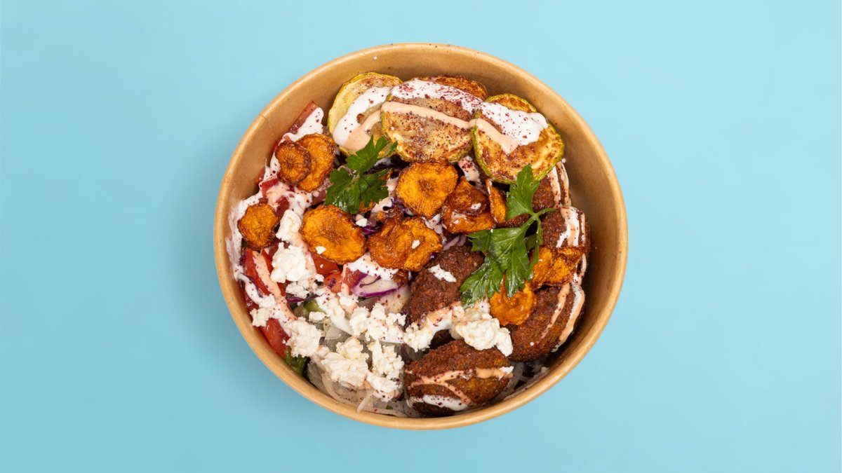 Хрупкав фалафел, свежи зеленчуци, хумус, тахини и веган йогурт сос – сервирани без хляб, в кутия. Лека, свежа и 100% веган наслада.