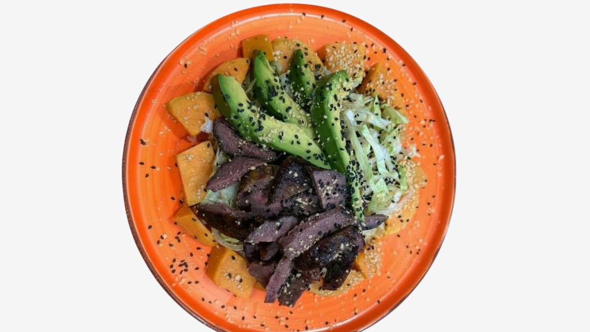 Сладък картоф, телешки кюфтета, авокадо, айсберг, сусам и печени фъстъци