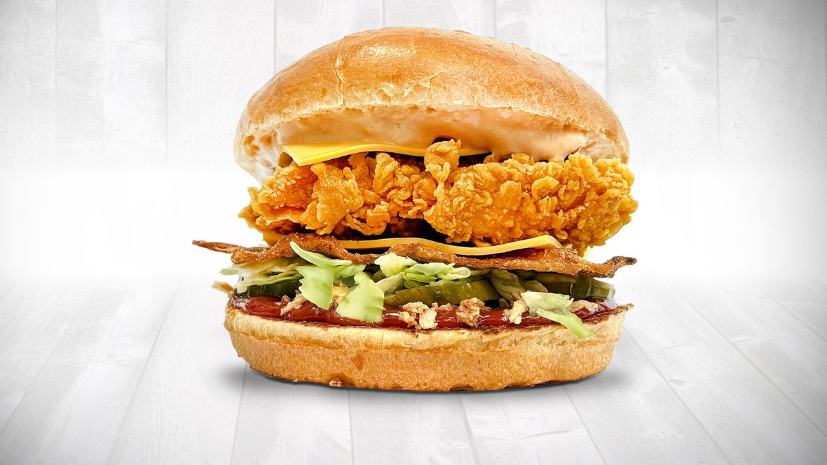Питка бриош, кетчуп, хрупкав лук, кисела краставица, айсберг, бекон, чедър слайс 2 бр, пил. филе, сос криспи`с