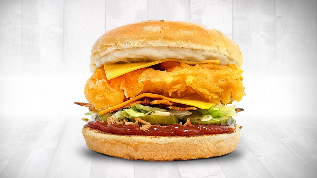Питка бриош, кетчуп, хрупкав лук, кисела краставица, айсберг, бекон, чедър слайс 2 бр, фиш тендърс 2 бр, сос тартар